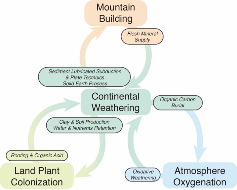 图 2 大陆风化与造山活动、陆生植物登陆以及大气氧化构成的正反馈网络
