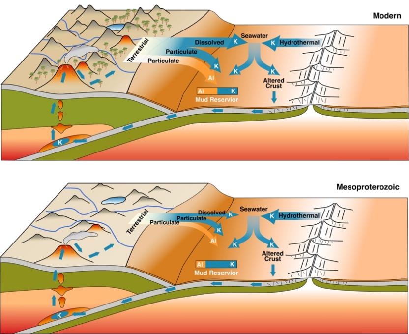 大气氧化是地球宜居性演化的重大事件,深刻影响地球多圈层相互作用。近年来,pg电子官方网站表生地球化学教育部重点实验室李高军教授团队重点关注大气氧化与大陆风化之间的相互作用。例如,新元古代大气氧化事件可能通过氧化作用,加深风化前锋带,增强风化作用CO2吸收效率,从而引起全球性雪球地球事件(Wei & Li, 2024)。根据风化带氧化推进假说,大陆风化与大气氧化理应存在耦合关系,但缺乏深时大陆风化记录予以支撑。最近,该团队根据元素地球化学循环原理,提出基于页岩K/Al大数据恢复大陆风化的新方法。大陆风化向海洋同时提供K和Al而洋壳风化仅仅提供K(图 1),大陆风化贡献占比越高,海洋页岩沉积K/Al越低。根据近1.8万个页岩数据集成,研究发现在晚新元古代-早古生代之后,大陆风化呈现数量级增长,与大气氧化过程密切相关。研究还认为,大陆风化P输入导致的有机碳埋藏与大气氧化之间存在正反馈作用,进一步促进大陆风化与大气氧化(图2);晚新元古代-早古生代大陆风化增强之后才能形成大量黏土,并深刻影响俯冲过程、造山运动、岩浆作用、金属矿产和油气资源的形成;大陆风化增强有利于岩石K、P等营养元素释放,产生的黏土也有利于陆地水分保持,这些因素可能是植物登陆的前提。