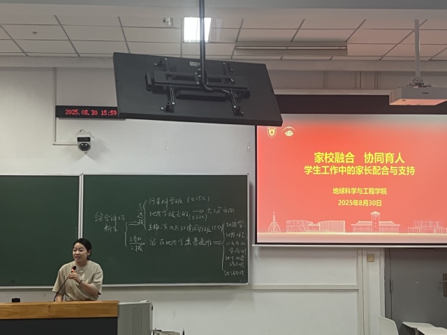 在丰富多彩的学科交流介绍后,辅导员陈昕老师以“家校融合,协同育人”为题,为刚迈入大学校门而尚且青涩的同学们与其家长提供了很好的建议和指导。她从“顺畅沟通渠道,打通家校融合桥梁”、“积极调试心态,夯实家校融合基础”、“支持学科探索,促进家校融合育人”三个主要方面介绍,令在场的同学和家长感受到来自地科院的热切关怀。求真且务实是稳健成长的基石,拓展与探索是缤纷世界的钥匙。从入学到毕业,家校协同一起来关心关爱促学生成长成才。