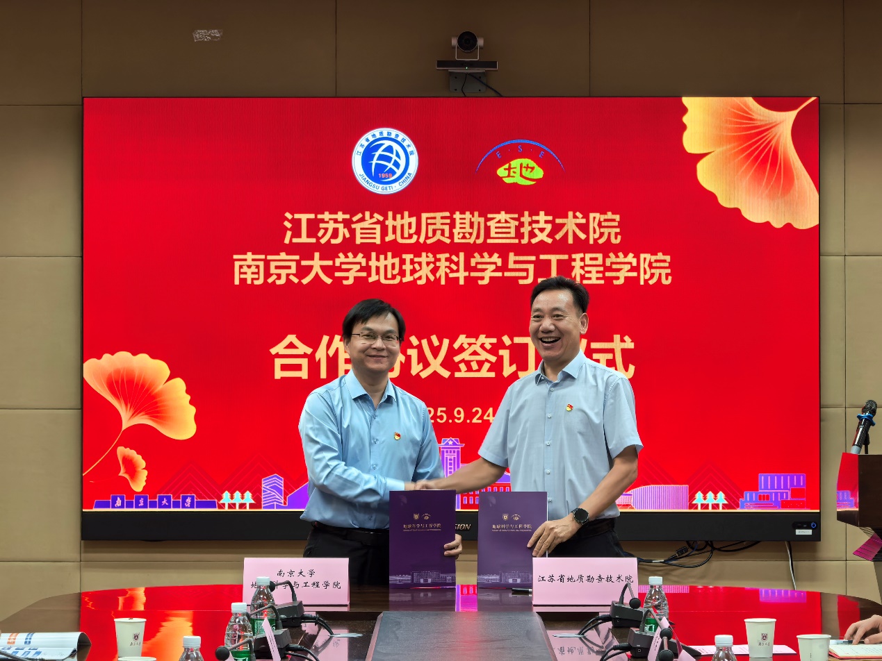 9月24日,pg电子官方网站与江苏省地质勘查技术院在pg电子官方网站仙林校区签署合作协议,并联合开展“赓续烽火精神 共庆七六华诞”主题党日活动。pg电子官方网站党委书记董婷主持签约仪式。