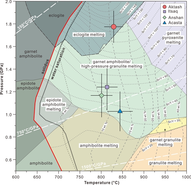 地球化学研究显示,阿克塔什片麻岩杂岩的原岩是英云闪长岩,且具有高压型TTG的地球化学特征,不同于Itsaq、Acasta和鞍山地区的始太古代中、低压型TTG。因此,阿克塔什片麻岩杂可能是目前已知全球最古老的高压型TTG。进一步的地球化学和热力学模拟结果表明,阿克塔什片麻岩的母岩浆可能来源于具有岛弧特征(富集大离子亲石元素)的太古宙玄武岩在1.8 – 1.9 GPa和800 – 830 ℃下由外来流体加入导致的部分熔融,表明熔融时的视地温梯度(apparent geothermal gradient)为400 – 450℃GPa-1,与典型的“热俯冲带”一致;而Itsaq、Acasta和鞍山地区的始太古代TTG的源区熔融压力仅为1.0–1.5 GPa,对应于正常或加厚的下地壳(图2)。此外,阿克塔什片麻岩的个别样品还记录了高Mg#、Ni、Cr等特征,这通常被认为是熔体与橄榄岩相互作用的结果。这在太古宙早期TTG中是十分罕见的,说明熔融发生在地幔楔之下,与现代俯冲带结构类似,不同于太古宙“平板俯冲”模型。研究据此提出,阿克塔什片麻岩杂岩的原岩可能是一个原始岛弧在岛弧拼贴或碰撞过程中被俯冲至地幔深度发生含水熔融并与地幔橄榄岩相互作用的结果。这一模型意味着,早在约37亿年前,地球至少局部已存在具有现代特征的板块俯冲和岛弧拼贴构造,比近年来许多学者提出的3.0 – 3.2 Ga的板块构造启动时间要早至少500个百万年。