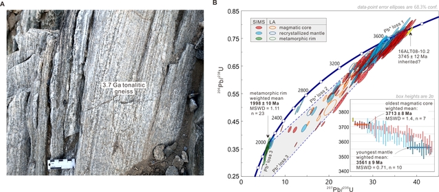 板块构造是何时启动的?大陆地壳是如何形成的?这是地球科学领域两个密切相关的基本科学问题,也是目前争议很大的国际热点问题。始太古代(3.6 – 4.0 Ga)(“Ga”代表“十亿年前”)TTG(英云闪长岩-奥长花岗岩-花岗闪长岩)是目前已知最古老大陆地壳的最主要组分,其岩石成因是理解大陆地壳的起源与板块构造的启动等问题的关键。始太古代TTG在地质记录中极为稀少,目前全球范围内仅在大约10个片麻杂岩中有所发现,如格陵兰的Itsaq杂岩(3.65 – 3.85 Ga)、加拿大的Acasta杂岩(3.6 – 4.03 Ga)和华北鞍山杂岩(~3.8 Ga),这些古老岩石大多遭受了多期变质变形和混合岩化,记录了复杂的锆石年龄组成和混合的全岩成分,为地球化学和同位素研究带来了困难。