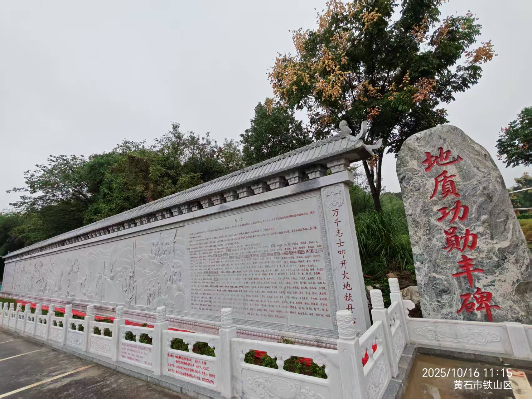 金秋十月,硕果辉映。2025年10月16日,备受瞩目的地质功勋丰碑在黄石国家矿山公园盛大揭幕。这座意义非凡的地质功勋丰碑,以花岗岩精心雕琢而成,高4.6米、长40米,稳稳地矗立在黄石国家矿山公园之上。它的诞生,源于中国冶金地质总局中南局退休老同志的深情倡议,得到了358名地质工作者、数名企业家及职工的慷慨捐助。在总局和中南局党委、黄石市及经济开发区铁山区相关单位和部门的大力支持下,这座丰碑顺利落成。我校校友史炳奇(原六〇九队副队长)担任了筹建领导小组副组长,为丰碑的筹建付出了诸多心血。