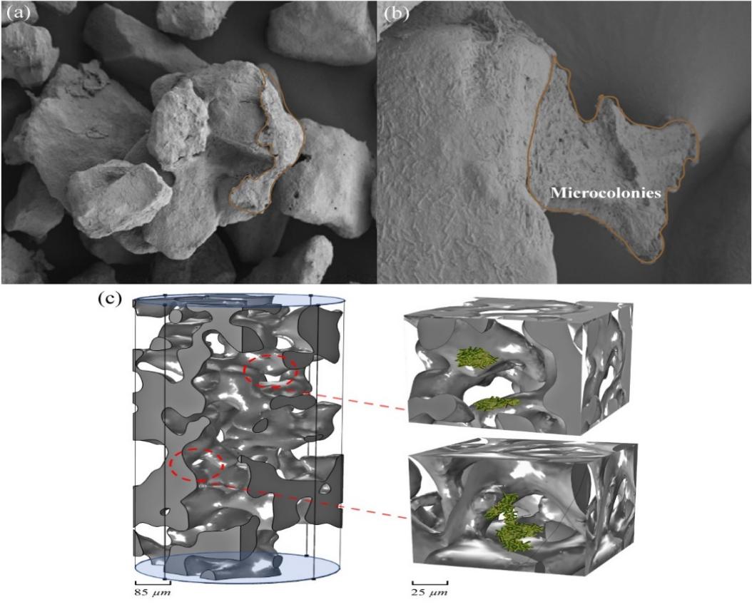 图3. (a)和(b)为微菌落包裹在土壤颗粒表面和连接土壤颗粒;(c)为多孔介质中微菌落结构3D示意图