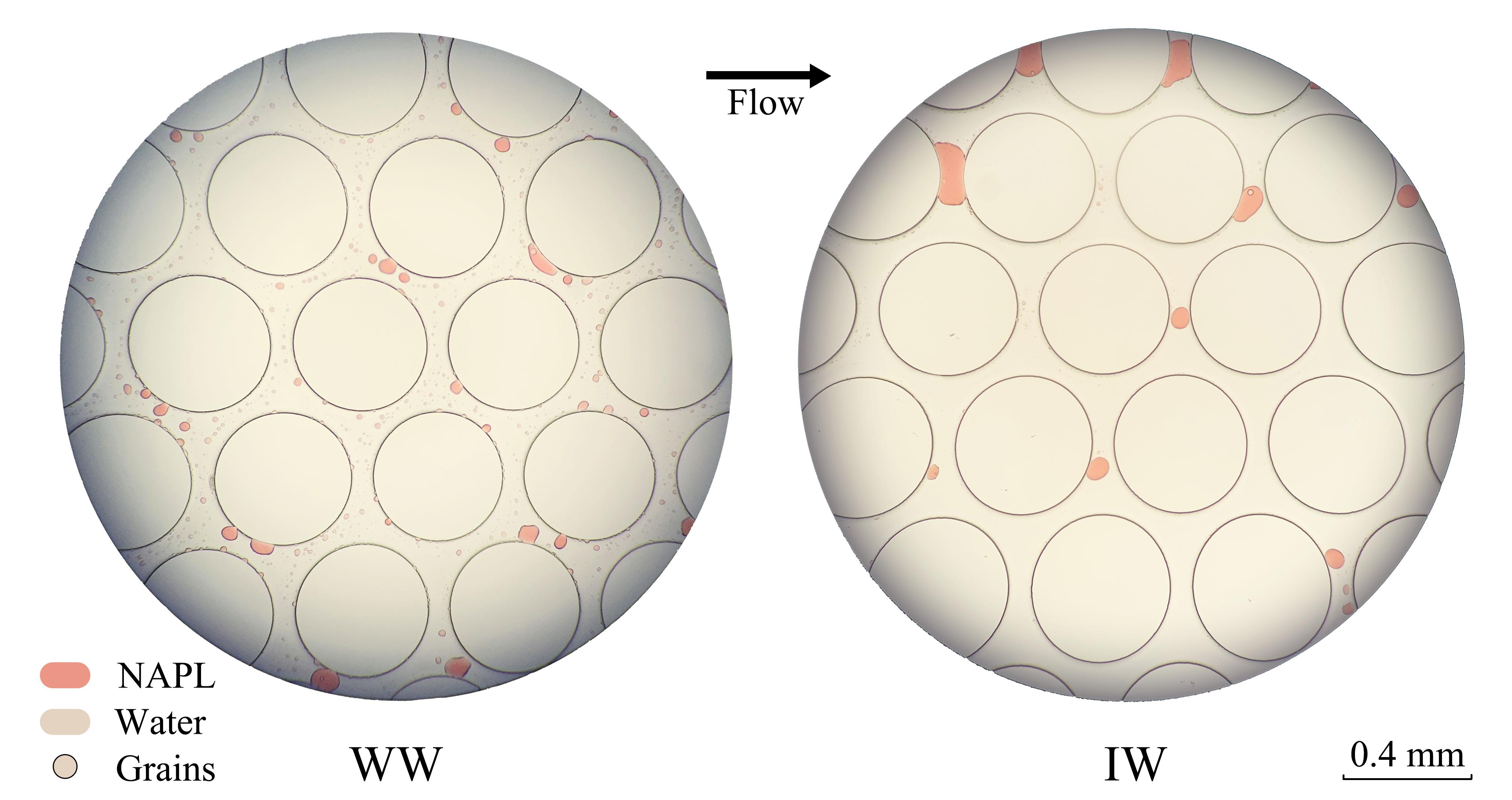 图1 二维水润湿(WW)与油润湿(IW)微孔隙模型经水驱替后产生的残留NAPL分布