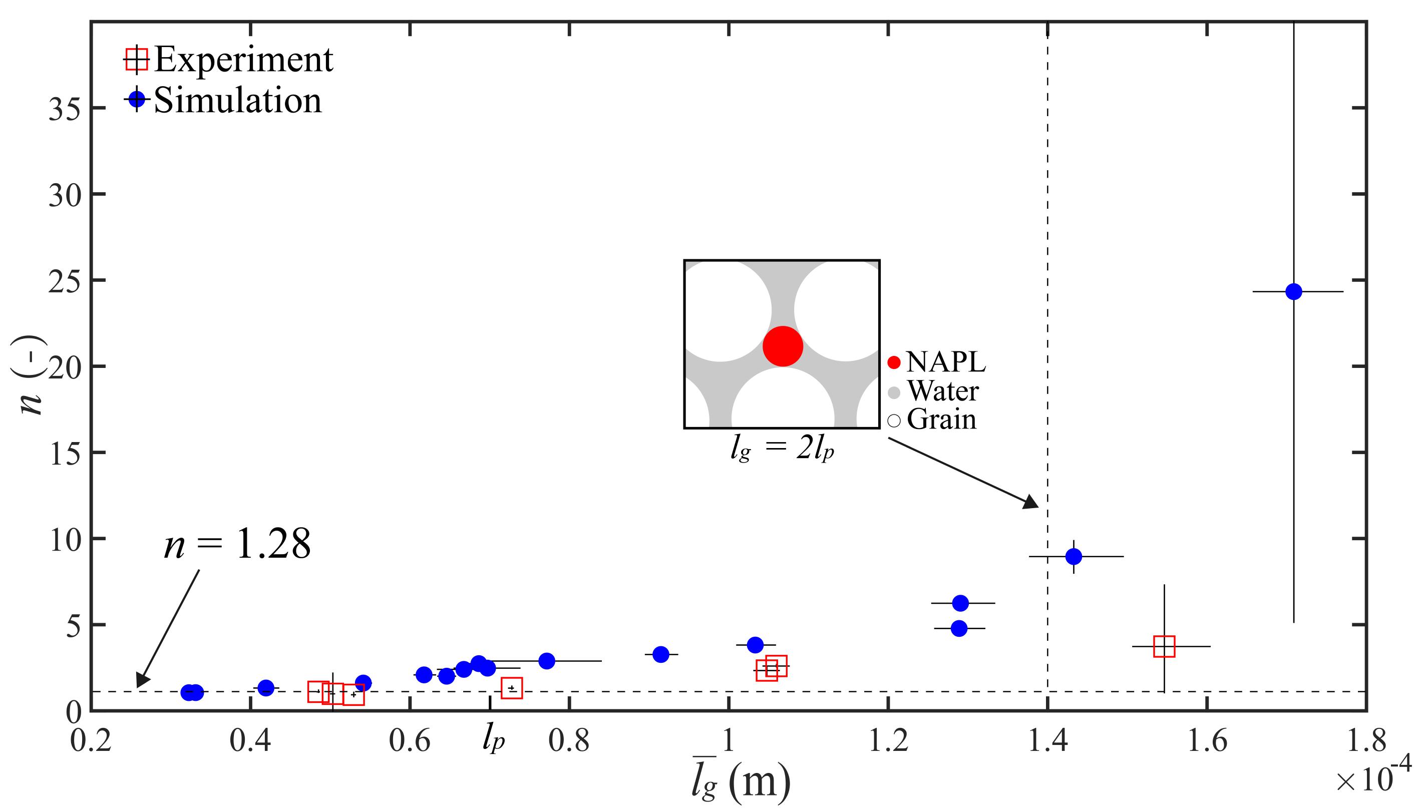 (3)阿奇定律的适用性同样与NAPL的形态有关,其饱和指数与残留NAPL的平均大小呈幂律相关关系(图5)。在室内和野外观测中,介质属性、饱和度、驱替速度等因素决定了残留NAPL的大小,从而影响饱和指数的选取。