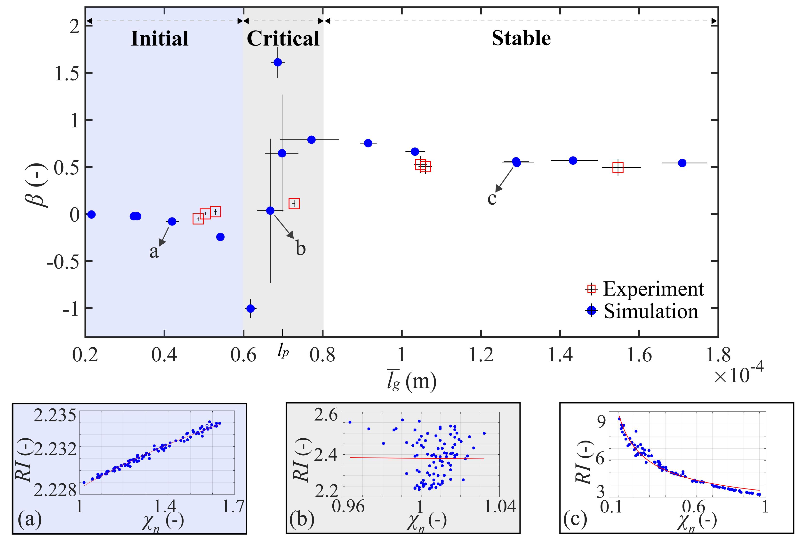 图4 在基于欧拉数与电阻率间关系的岩性物理模型中,指数β随孔隙中NAPL的平均大小变化的模拟与试验结果