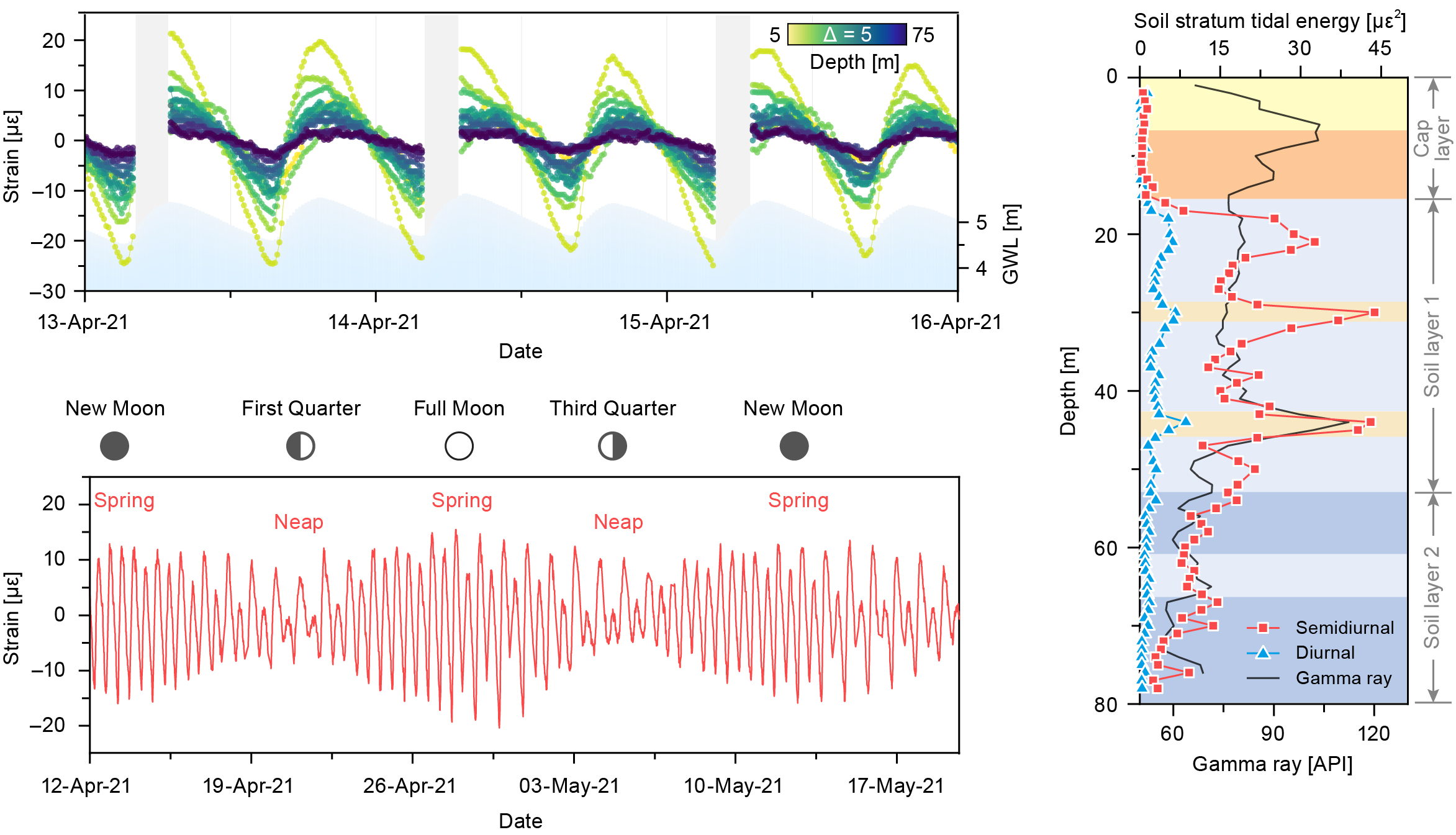 为破解这一谜题,pg电子官方网站施斌教授带领团队研发出了具有微应变精度的超弱光纤光栅地层形变感知系统,并将该系统安装在长江河口区指南村三个70米的钻孔中(图2),首次观测到了地层形变的半日潮(semidiurnal)和大-小潮(spring–neap cycle)现象,并与张诚成博士和荷兰瓦格宁根大学A. J. F. Hoitink教授通力合作,提出了"土层潮汐"(soil stratum tide)新概念,将其定义为河流潮汐影响范围内由于孔隙水压力波动而引起的土层周期性形变的现象,并揭示了土层潮汐与岩性和深度的依赖关系(图3)。