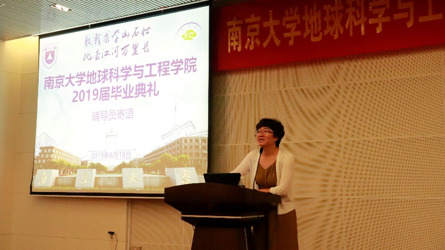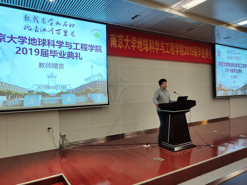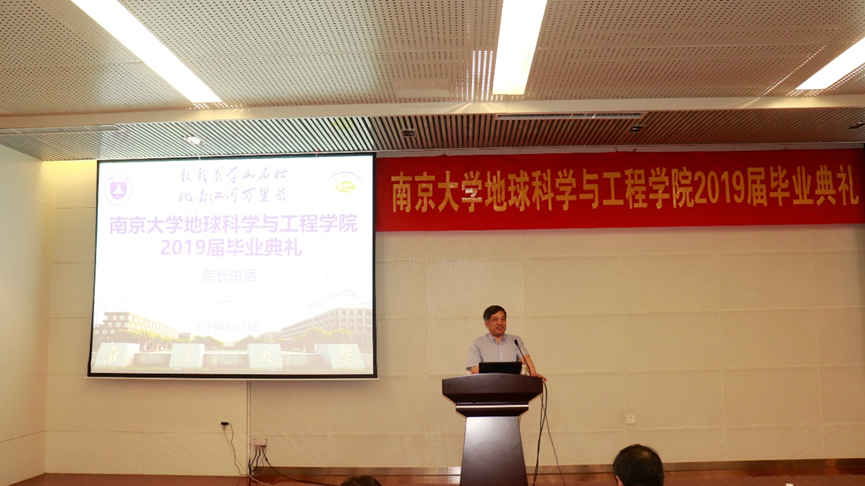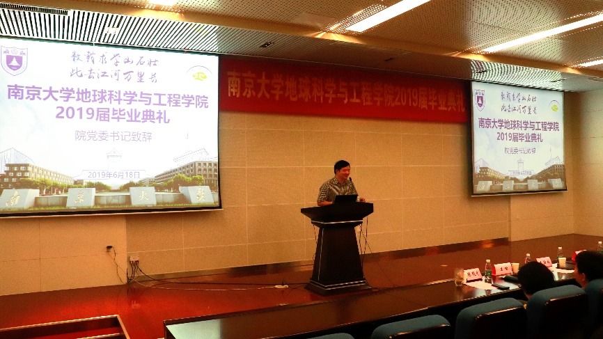 王汝成院长在致辞中首先对全体毕业生表达了衷心的祝福,对毕业生提出了三点希望。第一,毕业代表着人生的转折,这一个转折意味着对大家新的挑战和机遇,希望大家进入新的人生阶段后尽快适应新的生活;第二,希望大家在新的阶段尽快确立新的目标并为之奋斗;第三,希望每一位毕业生在今后不论是继续读书深造,还是走向工作岗位,都能为国家和社会做出自己的贡献。同时,王院长提出了南大地科院“两个一百年”的奋斗目标:到建系一百年时,南大地科成为世界一流学科;到建国一百年时,成为国际上地球科学领域有重要影响力的学科。南大地科从1921年建系,当前校友超过1万人,我们学院发展的接力棒今日交到了我们每一位南大地科人的手上,无论在大家毕业后继续在学院贡献还是成为学院的校友,都要像我们地科院院标的寓意一样,能够永远将我们地科放在心里,保持一颗强烈的个人自信心、社会责任心和爱心,时刻关注和奉献于地科的发展。