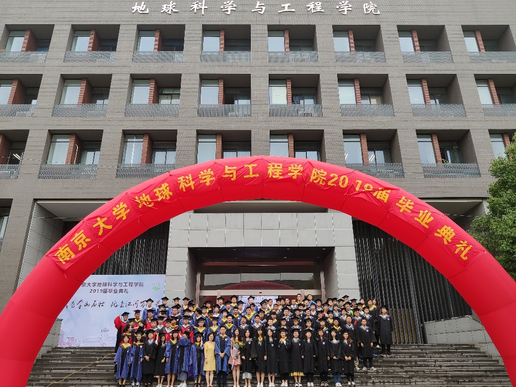 典礼的最后,全体毕业生冒着雨在学院门口集合拍摄了合影,在留言签名墙上签名,记录了在南大地科院最后的美好回忆,也代表着即将阳帆启航再出发。