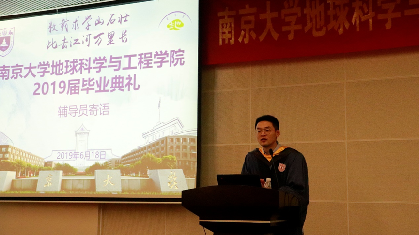 首先pg电子官方网站党委书记王唯老师发表致辞,代表学院向顺利完成学业的2019届68名本科生、102名硕士研究生、24名博士研究生表达了最热烈的祝贺和最衷心的祝福,向辛勤哺育学生的父母、辛勤教导学生的老师表达了最诚挚的感谢和崇高的敬意。王书记总结肯定了本科生四年里通过勤奋进取和执着追求在知识积累、实践训练等方面取得的可喜成绩,学院为之感到欣慰和自豪。四年里,本科同学一起学习、一起野外实习、一起举办学生活动、一起参与科研实践,获得了江苏省先进班集体、pg电子官方网站五四红旗团支部等荣誉,有50%以上同学参加过科研创新项目,9名同学获得国家级奖项,14名同学获得省级、校级各类奖项,52名同学获得过各类奖学金,4名同学将赴耶鲁大学、加州大学伯克利分校等境外一流高校深造,35名同学被南大、北大、中科院等国内一流高校或科研院所录取为研究生,10多名同学受到用人单位的青睐。硕士和博士研究生中,大多数同学即将走上工作岗位,部分同学继续深造。对研究生为地科院的学术科研发展以及如今的学术和社会影响所做出的重要贡献表达了感谢,对毕业生们取得成绩和表现出的风采感到骄傲和自豪。对毕业生提出了新的希冀,希望南大地科院的毕业生们在走向社会之后,能够始终牢记南大“诚朴雄伟,励学敦行”的校训,进一步发扬南大人“嚼得菜根,做得大事”的精神,以国家民族为己任的胸怀,怀揣高远志向,脚踏实地,在实现中国梦的伟大实践中,放飞青春梦想,满腔热情地投入到祖国的建设中。母校和母院永远是同学们事业发展的坚强后盾,欢迎大家常回家看看!