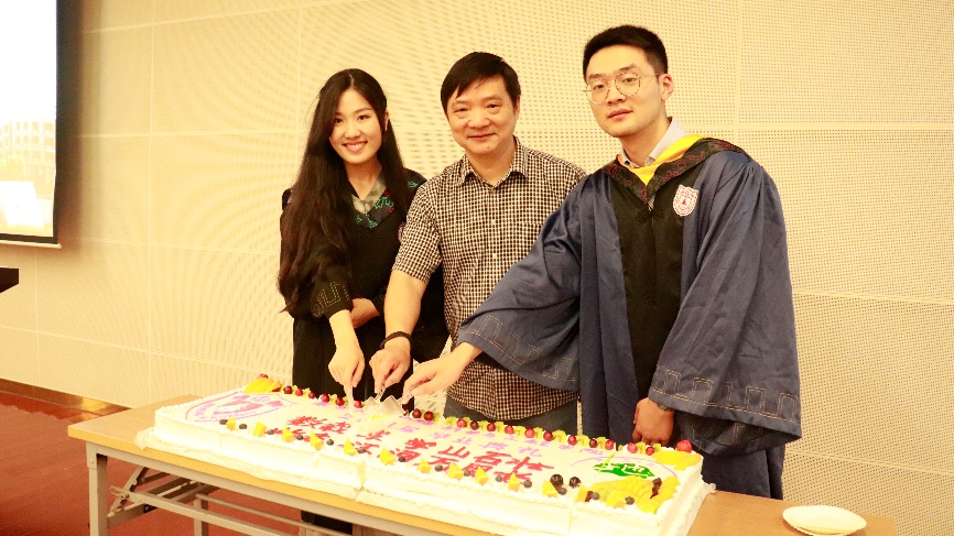 典礼进入尾声,王唯书记、本科生辅导员孙启程和毕业生代表庄子仪同学合切学院定制毕业蛋糕,象征着老师和毕业生们对未来的美好祝愿与期盼。