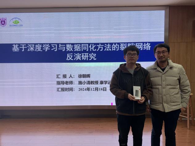 会上还邀请到了优秀的高年级研究生从科研、学业、就业等方面为同学们传经送宝,并为同学们做了精彩的学术汇报。2023级博士研究生孟胤全梳理了自身的科研历程和学习过程中遇到的挫折,以自己的亲身经历来分享自己的经验和体会,鼓励同学们不畏挫折困难;2022级硕士研究生徐朝晖作“基于深度学习与数据同化方法的裂隙网络反演研究”报告,为同学们呈现了一场精彩的科研汇报,同时也把自己对科研、生活以及就业方面的感悟分享给大家,建议同学们多和导师进行沟通交流,鼓励同学们勇于试错、早日确立方向并夯实基础;2023级博士研究生邓清文汇报了自身在水文序列非平稳性方向的科研成果,从“汲取、提问、探索、输出”的思路展开研究,并给出同学们关于就业以及科研和学习的技巧、方法。由三位老师依次向分享经验的高年级同学颁发礼品并合影留念。