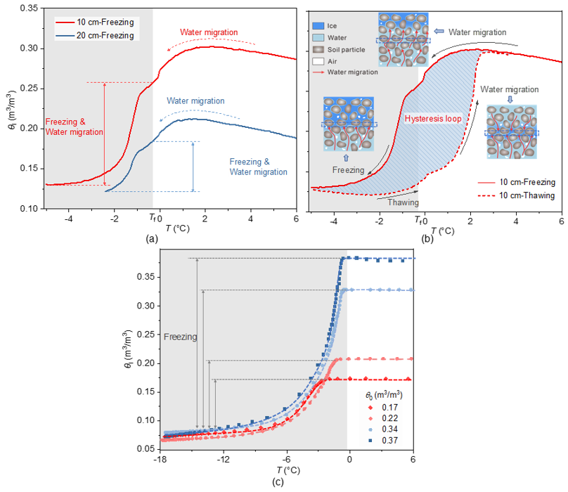图5. 土体冻结特征曲线的时空演化特征:(a)冻结过程中不同深度处的瞬态冻结特征曲线对比;(b)10 cm深度处完整冻融循环过程中的瞬态冻结特征曲线;(c)不同初始含水率条件下的稳态冻结特征曲线