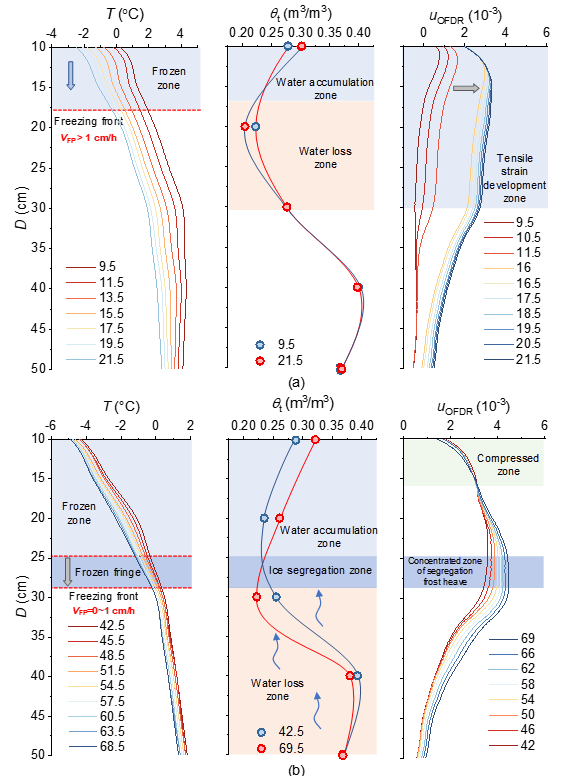 图4.不同冻结阶段土体热水力响应特征:(a)快速冻结阶段与(b)缓慢冻结阶段土柱温度、含水率和应变分布剖面