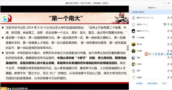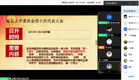 pg电子官方网站第十一次党代会是我校在深入学习贯彻习近平新时代中国特色社会主义思想、为实现“两个一百年”目标和伟大复兴中国梦而努力奋斗的征程中召开的一次重要会议,为建设“第一个南大”、推进“双一流”建设擘画了蓝图、指明了方向。学习贯彻落实党代会精神是我校各级党组织当前和今后一段时期的重要任务。为了进一步发挥党支部的战斗堡垒作用和党员的先锋模范作用,pg电子官网博士二支部于3月30日通过会议平台开展了线上主题党日活动。