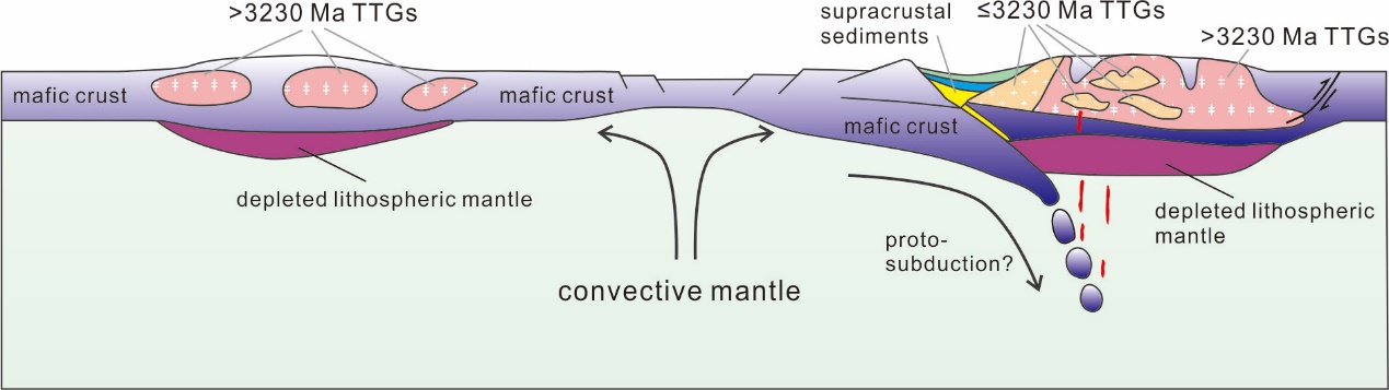 如今,地表物质深循环常发生于俯冲带边缘。但是Barberton的这一32亿年前的地表物质深循环与今不同,有着不同的诱发机制,可能是早期的一种特殊形式,可称为“原始俯冲”。由于早期地球的地幔温度更高,这种俯冲不能持续太久,可能是间歇的幕式出现的,这可能也是TTG岩石时代不连续的一个重要原因。这种原始俯冲可以使得地表的挥发分进入地球内部,并由于水的润滑作用推动正常俯冲的逐渐产生。