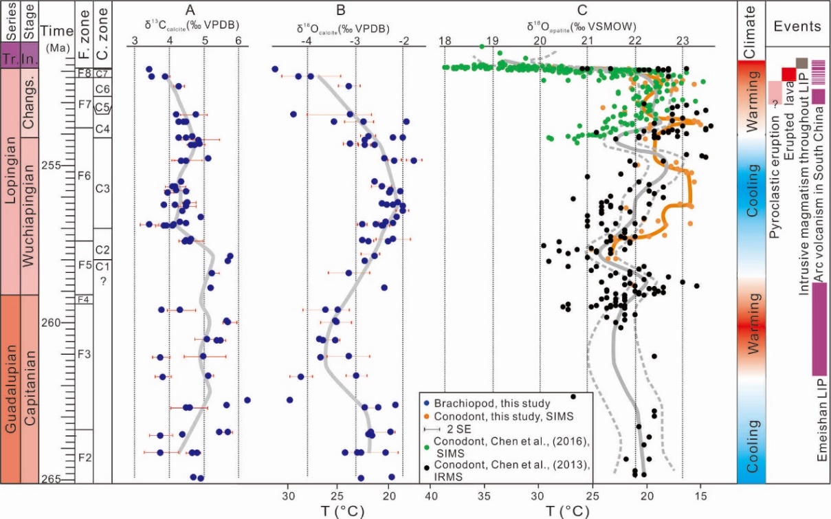 根据腕足类壳体氧同位素重建的古温度曲线显示,中-晚二叠世经历了两个冷期和两个暖期,经过对比,开匹顿(Capitanian)早期的冷期与Kamura变冷事件可以对应,开匹顿中晚期的暖期则可能由于峨眉山玄武岩的喷发引起的,吴家坪期早中期的冷期,可能是由于峨眉山玄武岩风化消耗大量大气CO2导致的,长兴期中晚期的暖期,可能由于西伯利亚玄武岩的形成导致。同时,瓜德鲁普世末生物灭绝对应了腕足化石氧同位素记录的暖期,而二叠纪末生物灭绝则发生在腕足化石氧同位素记录的最高温度处。