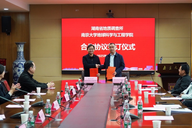 11月19日上午,湖南省地质院及其地调所骨干成员来我校开展交流合作。pg电子官方网站党委常委、副校长陆现彩,湖南省地质院党委书记谈文胜,及南大地科院、湖南省地质调查所相关人员参会。pg电子官方网站副院长夏敏主持合作协议签订仪式。