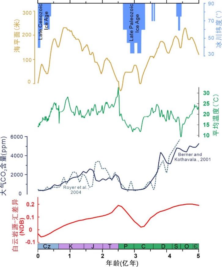 此研究发现,海水的Mg同位素组成在地质历史时期有巨大变化,δ26Mg值从20亿年前的+0.6‰波动变化至现代的-0.8‰,指示地球表层镁循环的深刻演变。论文研究团队通过蒙特卡洛同位素质量平衡模拟计算发现,海水的δ26Mg变化受到白云岩的源-汇差异(NDB)控制。在元古代,海洋中的镁大部分由硅酸盐风化提供,而主要以白云岩沉淀的形式从海水中移除,呈现巨大的白云岩源-汇差异;而在现代,白云岩对于海水中Mg的源-汇贡献基本平衡,几乎没有白云岩源-汇差异。由于白云岩沉淀时移除了CO32-,地表镁循环过程中的白云岩源-汇差异具有碳汇效应。白云岩源-汇差异(NDB)的演变,与地球环境的关键指标和驱动因子,如温度、大气CO2含量、海平面、冰川纬度等都存在显著的相关关系(如下图)。此研究揭示了地表镁循环的核心组成部分—白云岩的风化/成岩对于全球碳循环以及气候的重要调节作用,为理解地球的宜居性提供了新的视角。