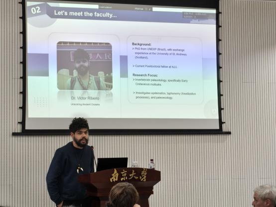 在教师分享环节,五位外教依次介绍了各自的求学经历与研究领域:Alexander Nemchin教授以宇宙化学为主题,阐述了地质学研究的基本方法;Shohei Hattori副教授从地球化学角度,展望了稳定同位素地球化学分析方法的发展前景;Das Souvik博士后结合地球材料科学与岩石学,生动解析了该领域的前沿动态;Victor Ribeiro博士后与Alessandro Paolo Carniti博士后则分别从古生物学出发,介绍了各自的研究重点与发展方向。分享内容翔实生动,不仅帮助同学们了解不同领域的研究方法与趋势,也激发了大家的科学思考,增进了对外教团队的初步认识。
