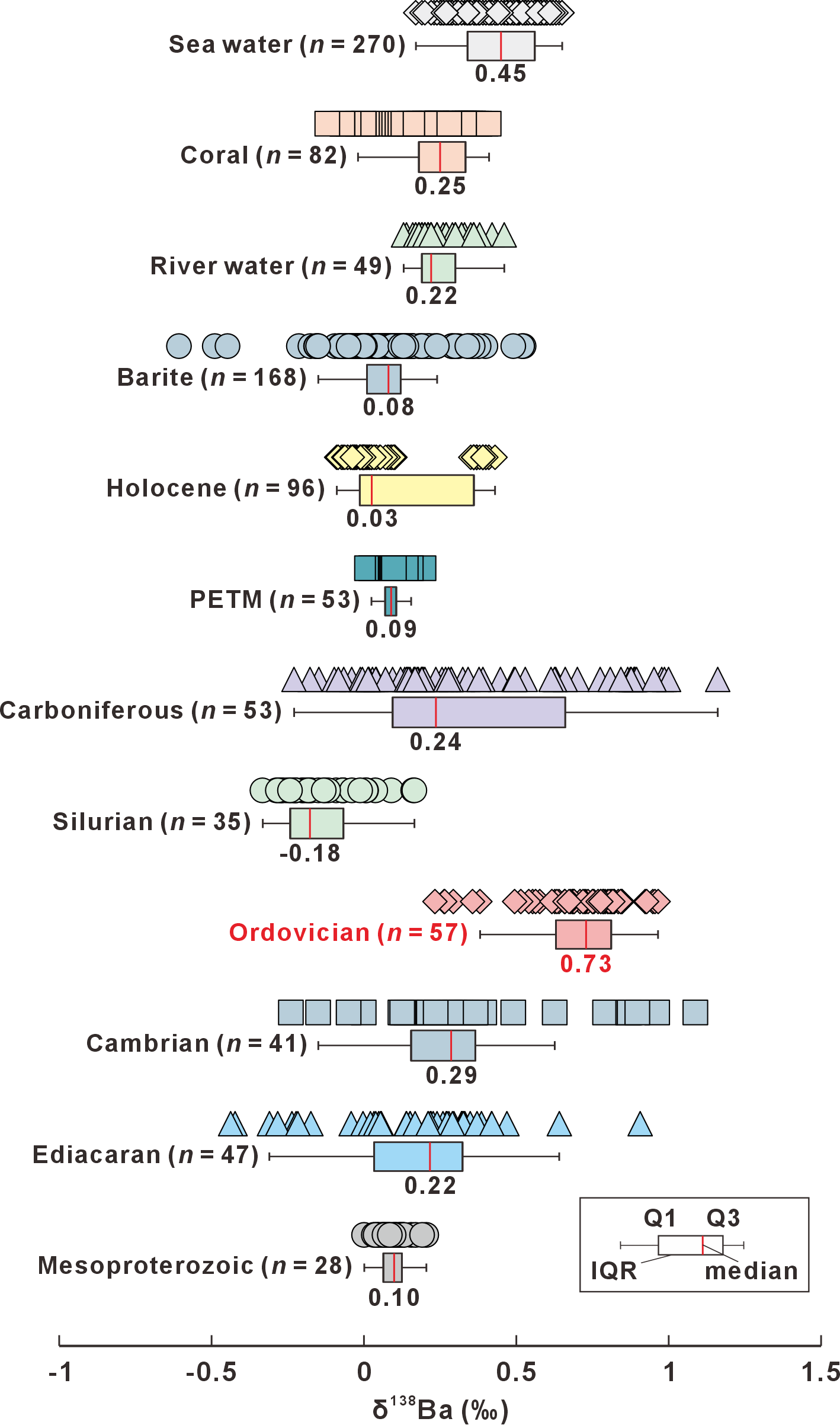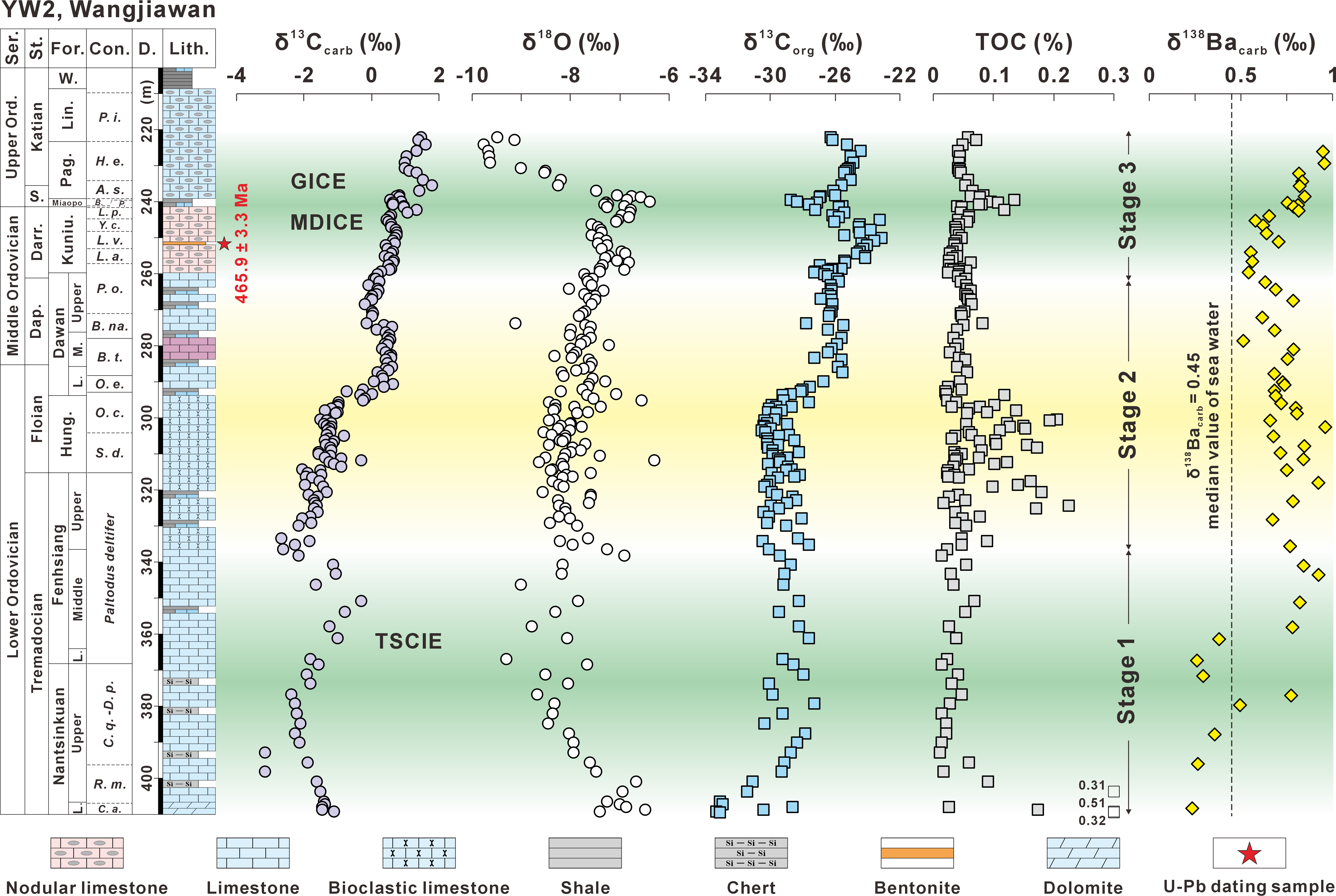 为了验证这一假说,研究团队对华南宜昌地区的YW2井的碳酸盐岩开展了钡同位素(δ138Bacarb)与碳同位素(δ13Ccarb、δ13Corg)两种指标的综合分析(图1)。结果表明,奥陶纪扬子海域的δ138Bacarb值显著偏高(中位数为0.73‰),远高于其他地质历史时期(中位数为-0.18‰至0.29‰)(图2),表明在强生物泵作用下,有机质矿化微环境中的钡被高效移出。此外,δ138Bacarb与碳同位素之间的协同变化(图3)进一步揭示,海洋初级生产力的持续增强,在长时间尺度上推动了有机碳的大量埋藏与碳同位素的波动上升,说明海洋初级生产力的提升确实是奥陶纪气候逐步变冷的重要因素之一(图4)。这项研究不仅厘清了奥陶纪气候变冷的关键机制,也为我们理解生物演化如何影响地球环境,提供了来自深时的地质实证与重要启示。