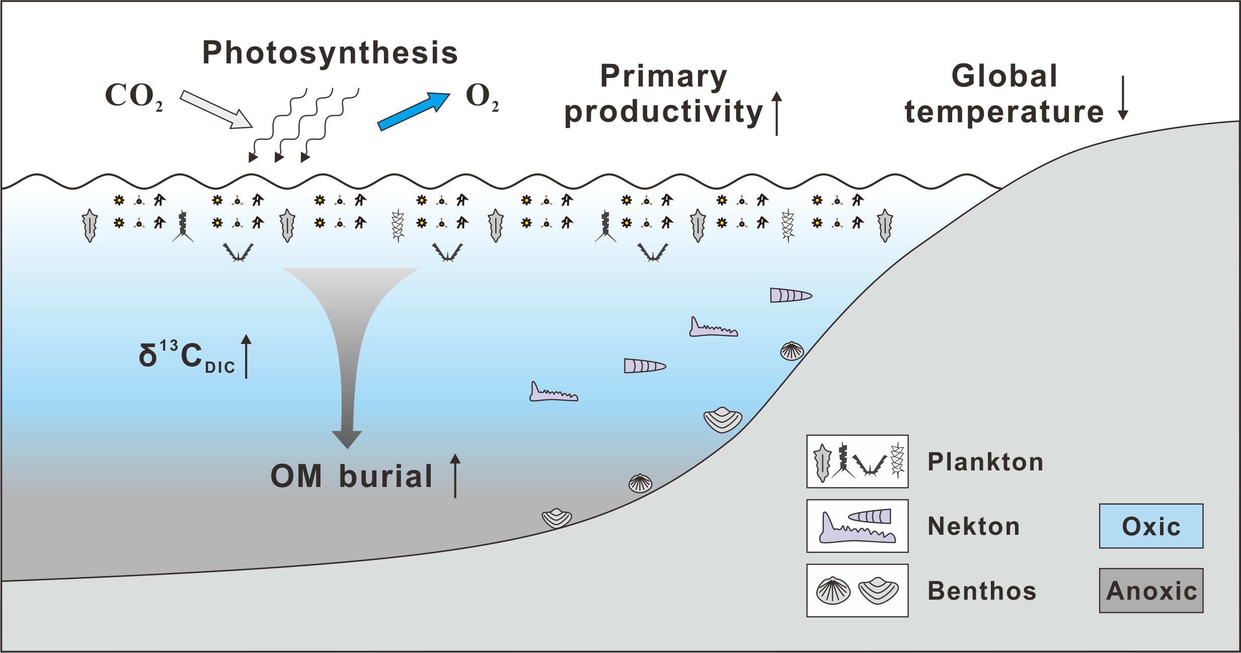 研究团队的前期工作表明,在奥陶纪生物大辐射期间,浮游生物的多样化速度和规模远超游泳和底栖生物(Deng & Fan* et al., 2021, Earth-Science Reviews)。浮游生物的大量繁衍可能显著提升了海洋初级生产力水平,通过光合作用大量吸收大气中的二氧化碳,降低其分压,最终引发全球气候变冷。这一“生物演化驱动环境变化”的新视角,为理解奥陶纪生物大辐射、气候变冷与大气氧含量上升等多重事件的耦合关系提供了一个可验证的科学假说,其中海洋初级生产力水平与碳循环过程被视为连接生物演化与环境变迁的关键纽带。