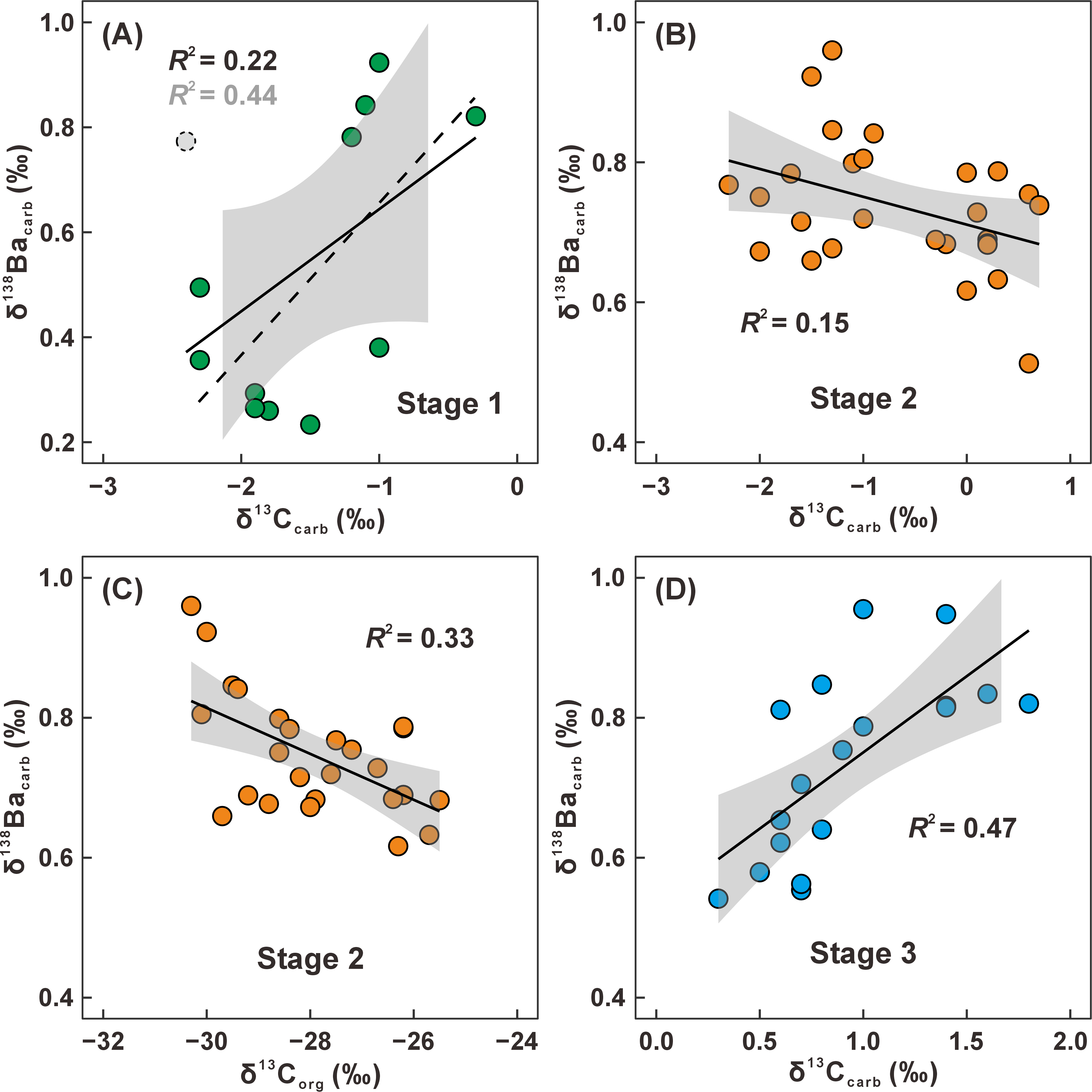 图3 奥陶纪不同阶段钡同位素与碳同位素协变关系