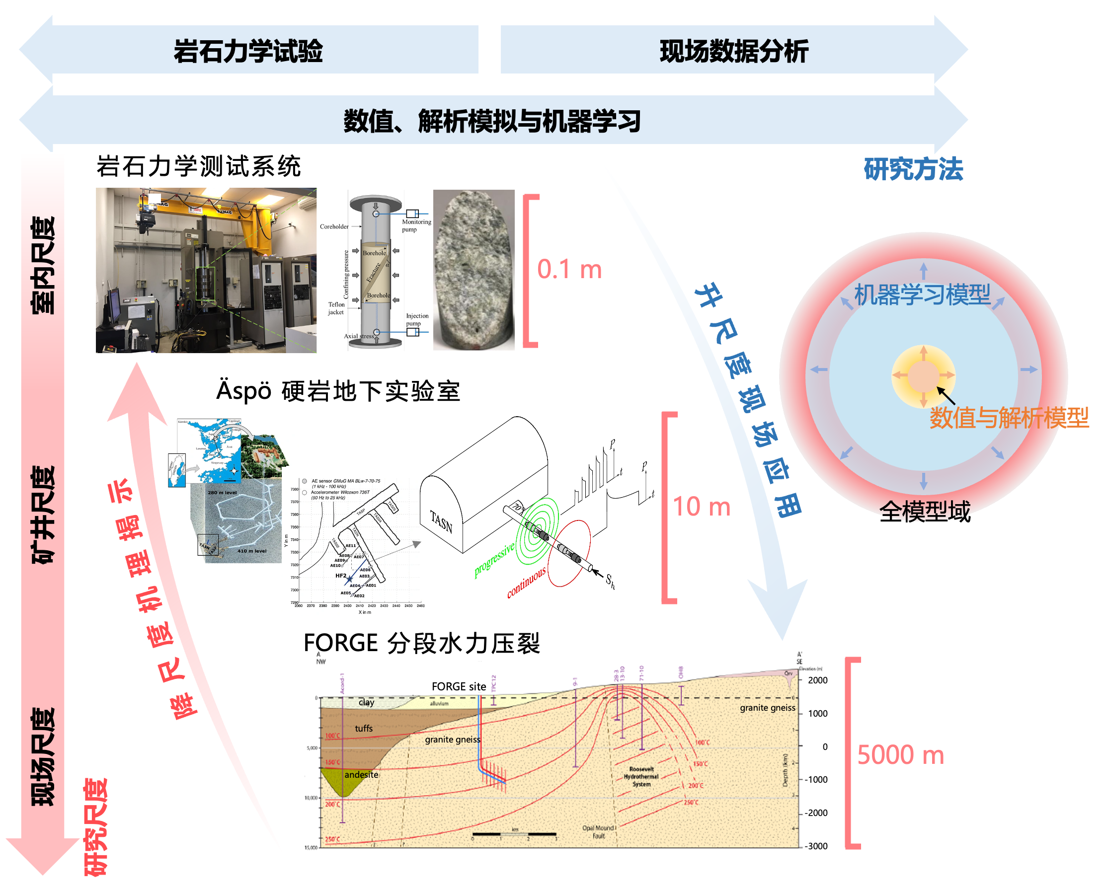 图3本文提出的跨尺度、多方法的综合研究策略。实验室尺度试验有助于揭示现场尺度观测现象背后的基本物理机制。这些机制可通过矿山尺度试验加以验证,并进一步应用于现场尺度的地热工程项目。而数值模拟、解析方法以及机器学习技术是连接不同尺度过程、提升解释能力与预测能力的关键工具。