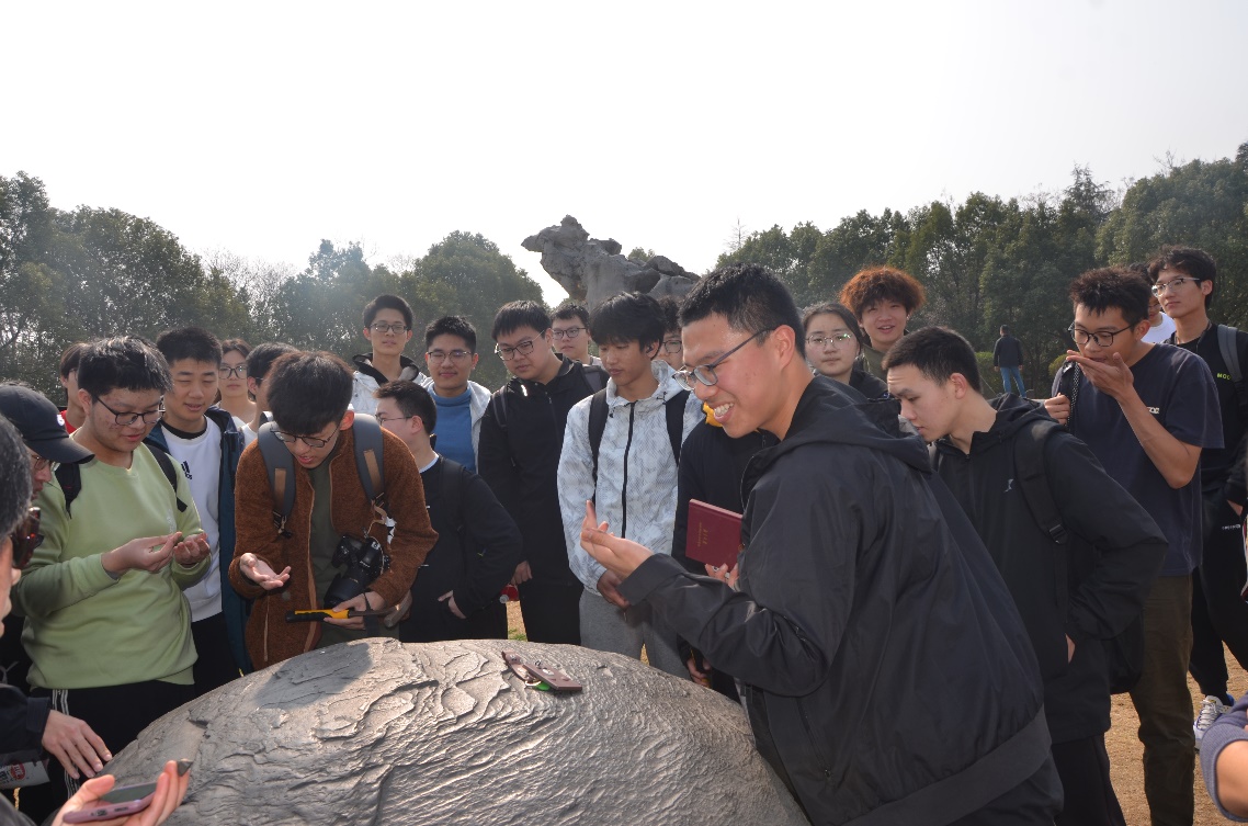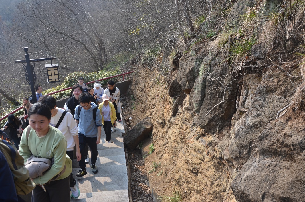 同学们在地质考察活动中不惧挑战,表现出色。“十八盘”是方山最陡最险的山路,沿途主要是气孔状玄武岩,陡峭的石阶一个接着一个,必要时需要手脚并用。老一辈科学家程裕淇院士考察方山地质时走过这条小道。大家一鼓作气,但最终也满脸通红,气喘吁吁,感受到老一辈地学人的艰辛和毅力。在成功登顶后,俯瞰江宁区,又觉神清气爽。同学们还组织了生动有趣的游戏环节,在明媚春光中,一扫教室中紧张学习的疲惫与倦怠,草地上笑语连连。老师们也都参与进来,和同学们打成一片。