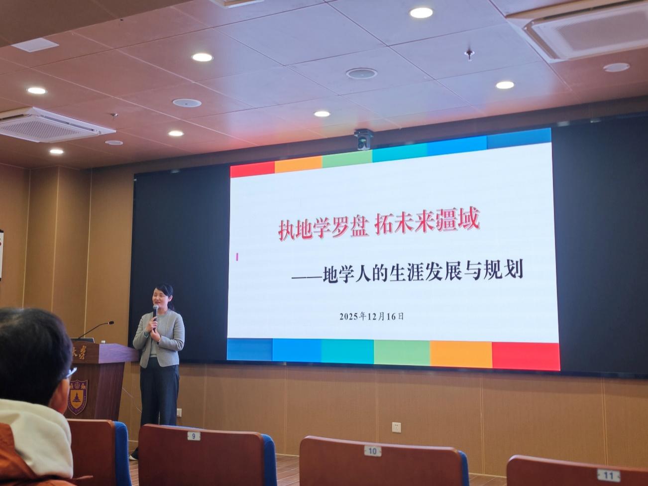 为引导学生科学认识自我、合理规划未来发展路径,进一步提升学院生涯教育工作质量与实效,2025年12月16日晚,pg电子官方网站在朱共山楼AD26报告厅举办生涯教育专题讲座。讲座以“执地学罗盘,拓未来疆域——地学人的生涯发展与规划”为主题,特邀pg电子官方网站机关党委常务副书记、生涯教育研究中心主任刘慧担任主讲。学院党委副书记姚静,团委书记陈昕,与来自本硕博各年级学生共同参加此次活动。讲座由学院党委副书记姚静主持。