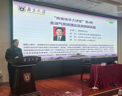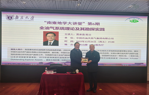 2025年12月26日下午,“南雍地学大讲堂”第六期学术报告会在朱共山楼144报告厅举行。本次论坛邀请了中国科学院院士、我国著名石油地质与构造地质学家贾承造院士围绕“全油气系统理论及其勘探实践”主题作学术报告。报告会由陈天宇院长主持,院内外两百余名师生学者参加了报告会,现场气氛热烈、座无虚席。