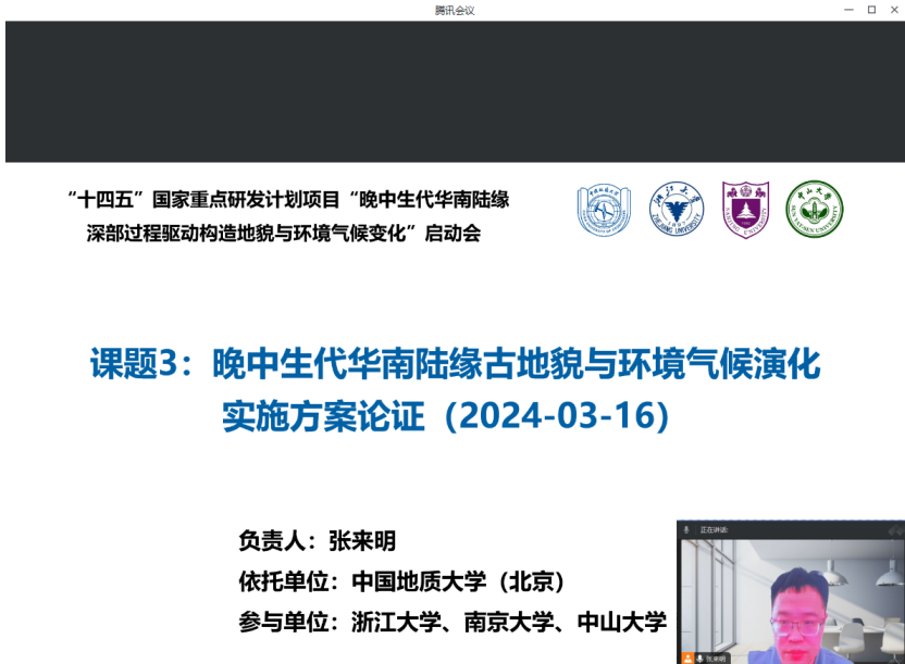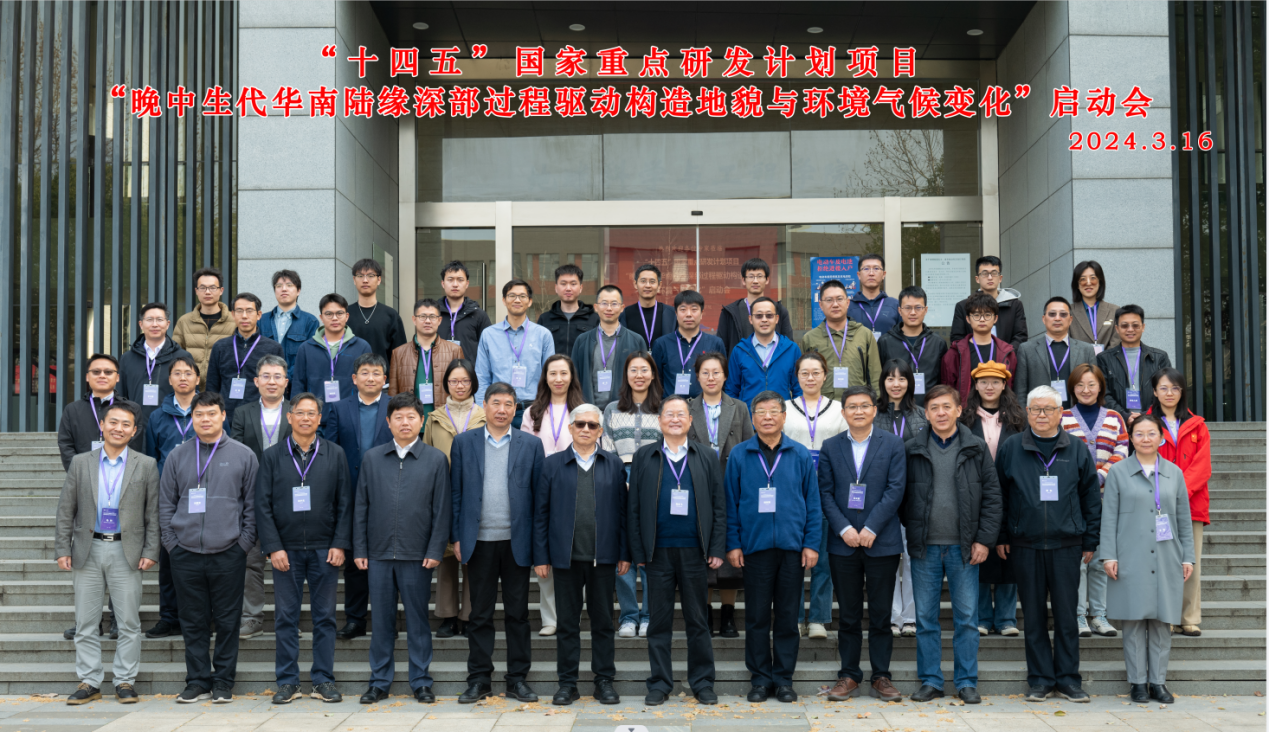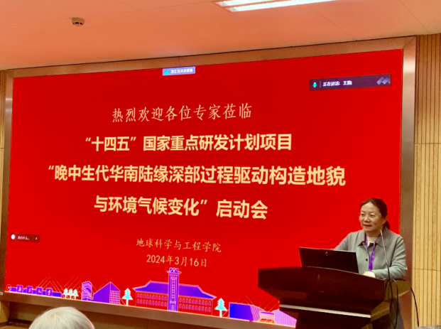 2024年3月16日,由pg电子官网王勤教授主持的“十四五”国家重点研发计划项目“晚中生代华南陆缘深部过程驱动构造地貌与环境气候变化”启动会在pg电子官方网站朱共山楼举行,项目主管部门领导、项目指导委员会专家、骨干成员等60余人,通过线上和线下参加会议。该项目联合了pg电子官方网站、中山大学、中国地质科学院地质力学研究所、中国地质大学(北京)、浙江大学、中国地质科学院等单位进行协同攻关。