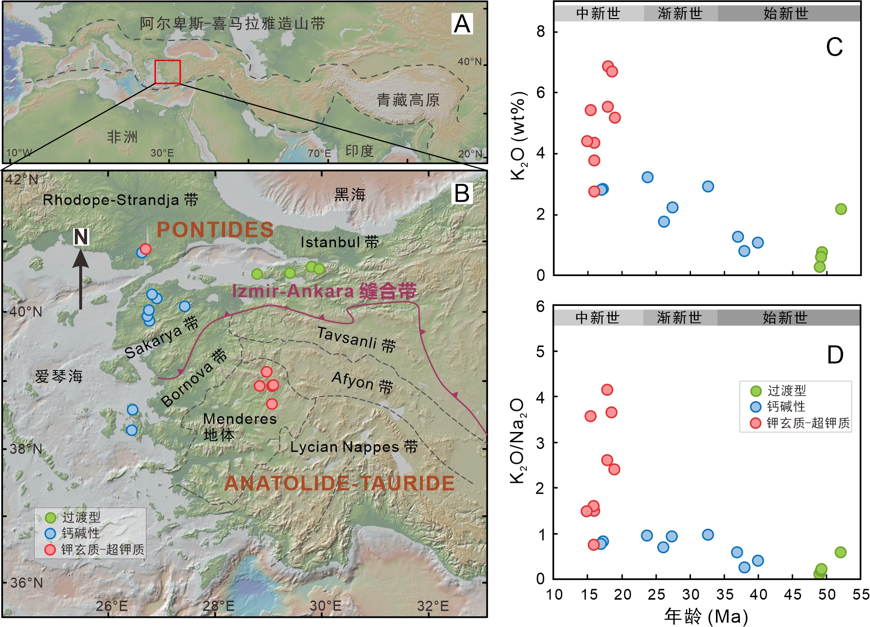 图1(A)和(B)分别为阿尔卑斯-喜马拉雅造山带和安纳托利亚地质简图。(C)和(D)分别表示火山岩K2O含量和K2O/Na2O比值随时间变化。