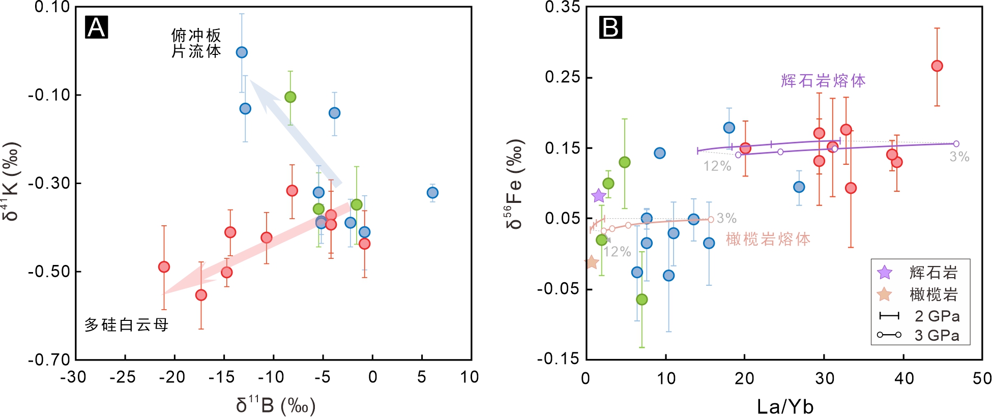 图2 (A)火山岩K同位素组成与B同位素组成相关图。(B)火山岩Fe同位素组成与La/Yb比值协变图。实线代表基于pMELTS模拟结果计算的橄榄岩和辉石熔体δ56Fe-La/Yb值(熔融程度为3~12 wt%,压力为2~3 GPa)。