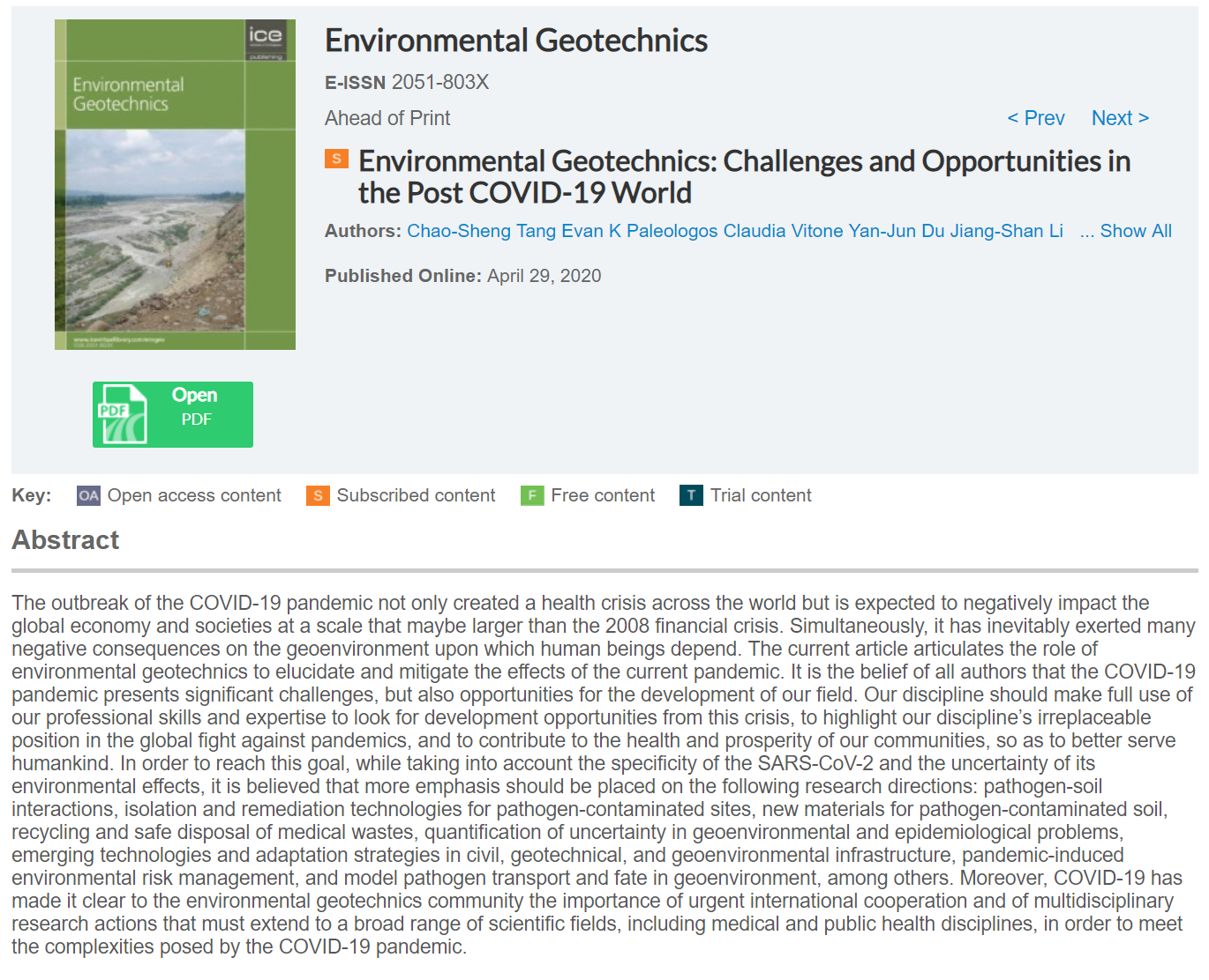 图1 论文在线发表截图(https://www.icevirtuallibrary.com/doi/abs/10.1680/jenge.20.00054)