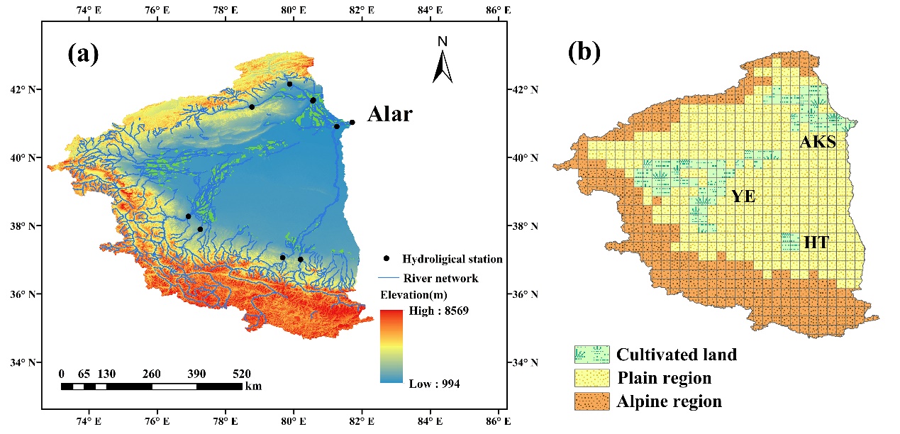 图1. 塔里木河流域源流区(a)及耕地分布(b)的示意图