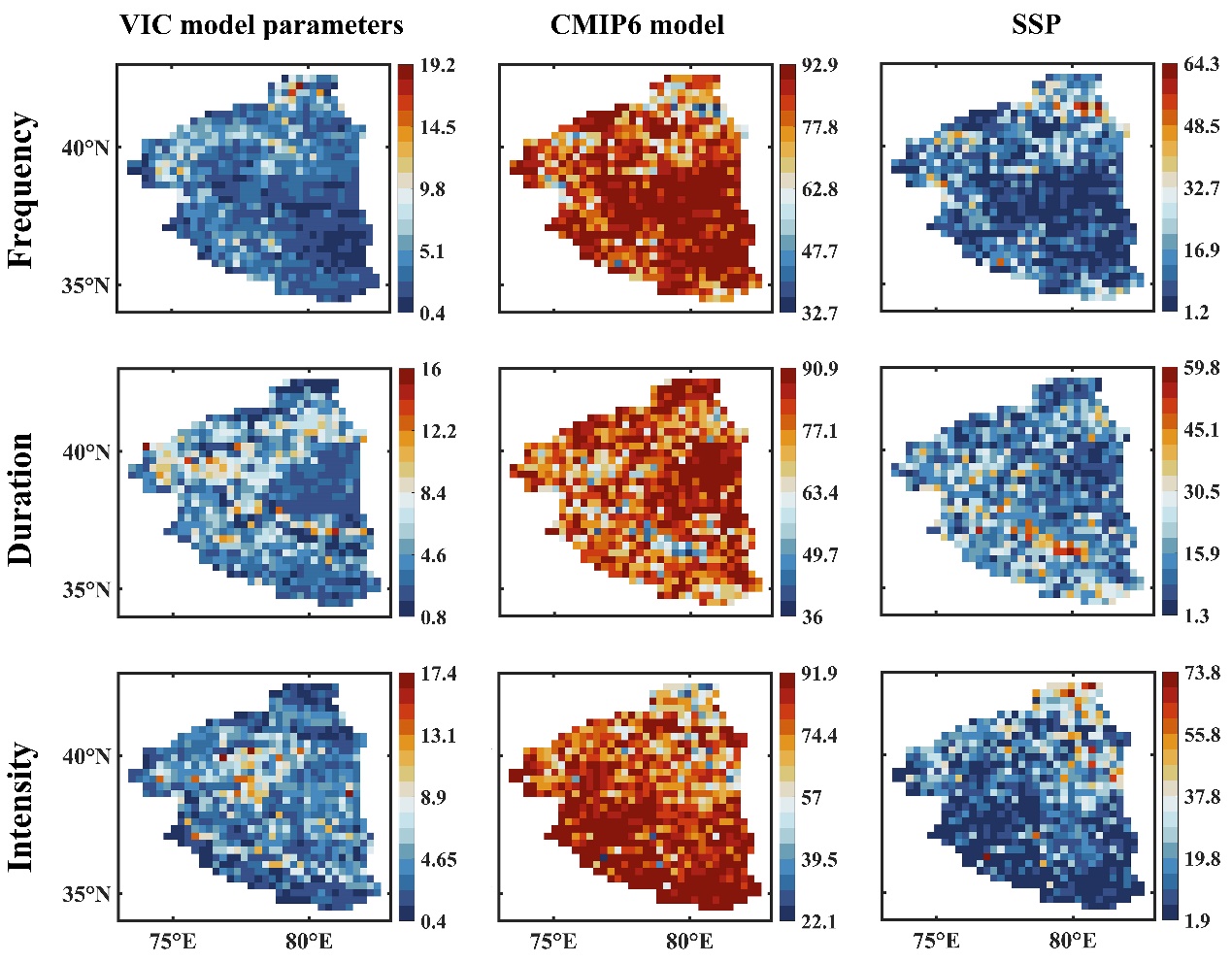 论文主要发现包括:(1) 基于贝叶斯不确定性分析的VIC模型可以有效刻画研究区水文循环过程(图2);(2) 未来时期(2021-2100),山区相比于平原区具有更高的骤旱频率和强度;(3) 骤旱预测的最大不确定性来源为CMIP模式(贡献81%),其次为SSP情景(贡献15%)和VIC模型参数(贡献4%)(图3)。
