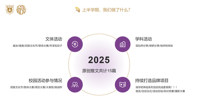 上半学期,地科院学生会在学院党委领导和团委指导下,紧密围绕同学需求,组织开展了一系列内容丰富、形式多样的活动。从学术交流到文体活动,从宣传推广到日常服务,各部门协同合作,稳步推进各项工作,取得了阶段性成果。