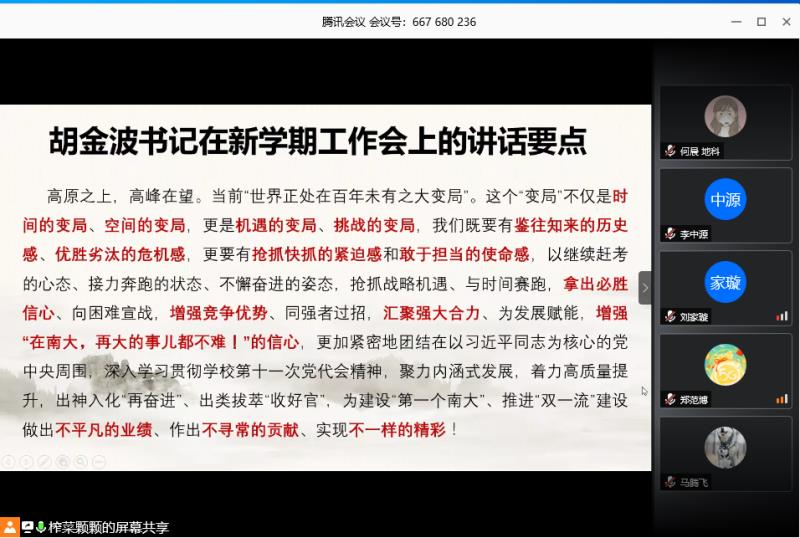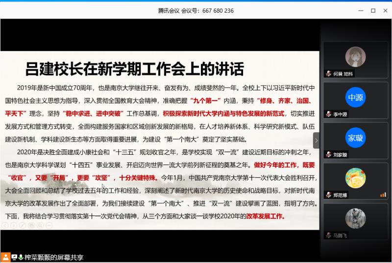 随后,党支部书记查日环带领大家一起学习了中共pg电子官方网站第十五届委员会第二次全体会议暨新学期工作会精神。对胡金波书记和吕建校长在新学期工作会上的讲话进行解读,引导大家理论武装自我,提高思想觉悟,切实履行自己的职责和任务。2020是决胜全面建成小康社会和“十三五”规划收官之年,是学校实现“双一流”建设近期目标的冲刺之年,也是pg电子官方网站科学规划“十四五”事业发展,开启迈向世界一流大学前列新征程的奠基之年。值此之际,我们要牢记主人翁意识,为建设“第一个南大”、推进“双一流”建设做出不平凡的业绩、做出不寻常的贡献、实现不一样的精彩!