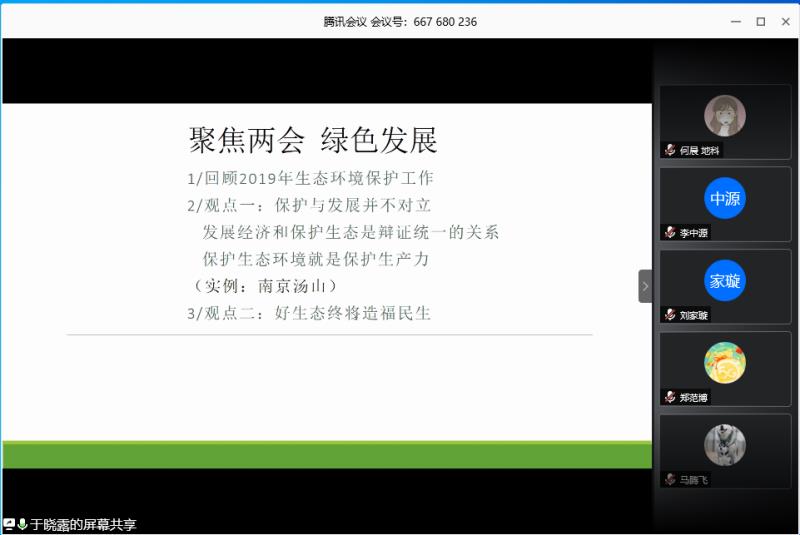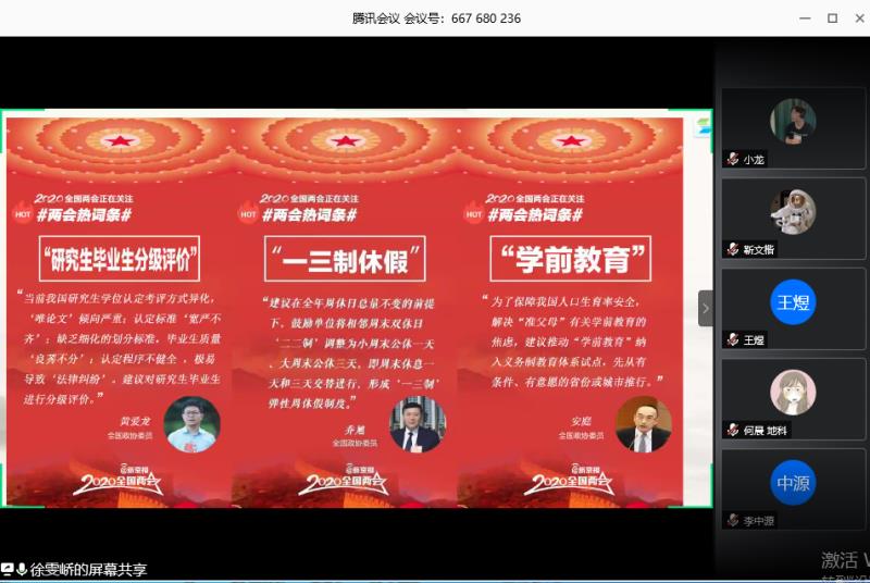首先由组织委员徐雯峤带领大家简要学习了两会的焦点内容,向大家做简要解读了十三届全国人大三次会议政府工作报告,主要包括全面建成小康社会决胜之年的一系列战略部署,新冠疫情下的经济发展,一系列民生问题以及与我们息息相关的研究生教育制度改革等,旨在带领大家深入了解国家一系列战略部署和两会讨论的焦点问题,紧跟时代步伐,结合国家建设发展需要思考自身未来职业发展导向。