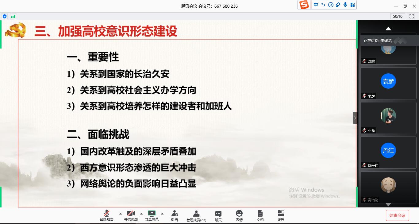 意识形态工作是党的一项极端重要的工作,习近平总书记在党的十九大报告中明确指出:建设具有强大凝聚力和引导力的社会主义意识形态。此次会议中,宣传委员李绪龙引导全体党员进行意识形态学习,强调党员自身要树立正确的意识形态,主动发挥党员在广大群众中的榜样力量和标杆作用。高校是意识形态工作的前沿阵地,身为学生党员,要带头维护主流意识形态,深入理解意识形态的深刻含义,做到思想上要统一,行动上有作为,充分发挥战斗堡垒和先锋模范作用。