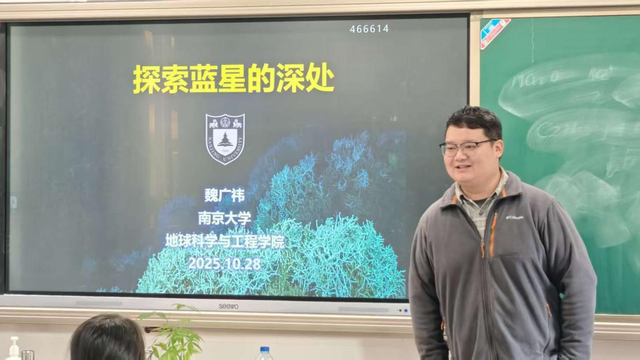 在10月28日的第六次课程中,魏广祎老师带来了主题为“探索地球的深蓝”的报告。魏广祎老师从海洋研究的意义和主题、海洋科学发展历史、典型海洋地质学科学问题以及如何开展海洋地质研究等四个方面进行了讲解。报告首先从海洋在现代地理学和地质学研究中所扮演的重要角色入手,向同学们具体介绍了海洋学研究在全球气候研究、生态环境、能源资源等方面的突出地位,并从科学史的角度介绍了国内外关于海洋科学研究的发展过程。接着,通过典型研究案例向同学们讲解了如何利用海洋沉积物开展古气候和古环境研究,重点介绍了海洋钙化生物壳体在海洋地质研究中的基本原理和重要应用,最后,魏广祎老师以我国自主设计建造的“梦想号”大洋钻探船为切入点,说明了国际大洋钻探计划的发展历史和取得的重大成果,并介绍了我国在国际大洋钻探中扮演的重要角色和未来10年大洋钻探的发展规划,启发了同学们的思考,鼓励大家投身海洋科学研究,为未来我国的海洋学研究贡献自身的力量。在课间和课后魏广祎老师还与金中的同学们进行了热烈交流,分享了自身在古海洋环境研究中的心得和感受。