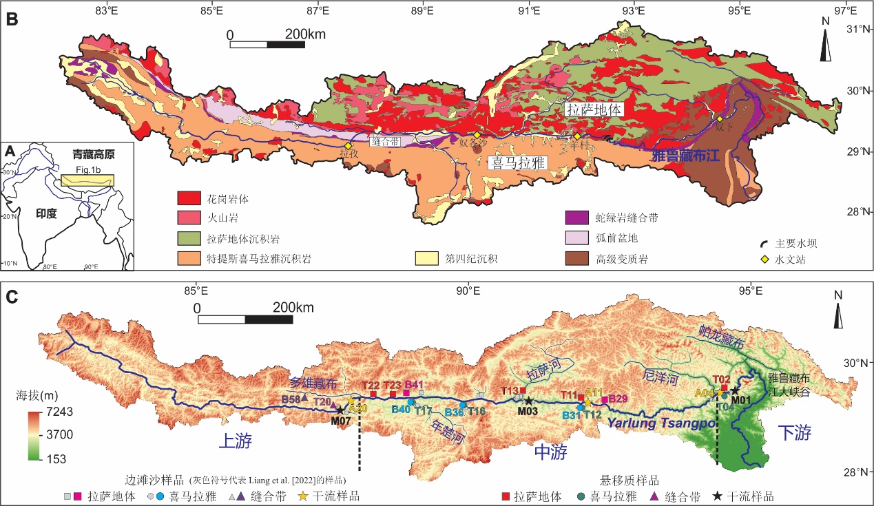 图1 雅鲁藏布江流域地理位置(A)、地质(B)及采样分布(C)。