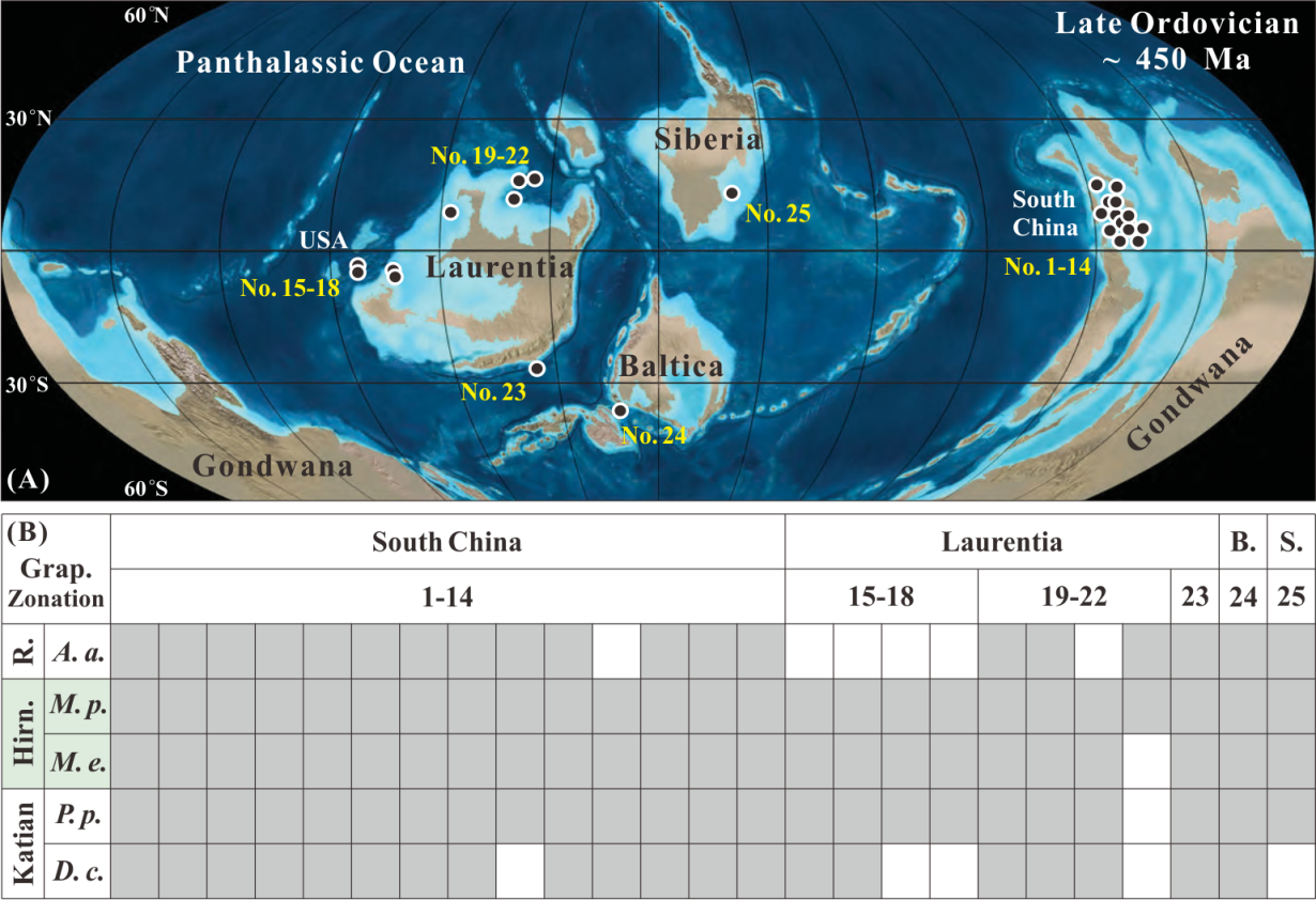 图1. 本研究汇编剖面的古地理位置与生物地层信息。