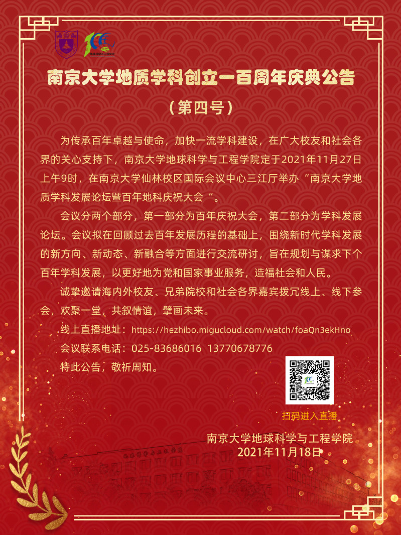 pg电子官方网站地质学科创立一百周年庆典公告(第四号)