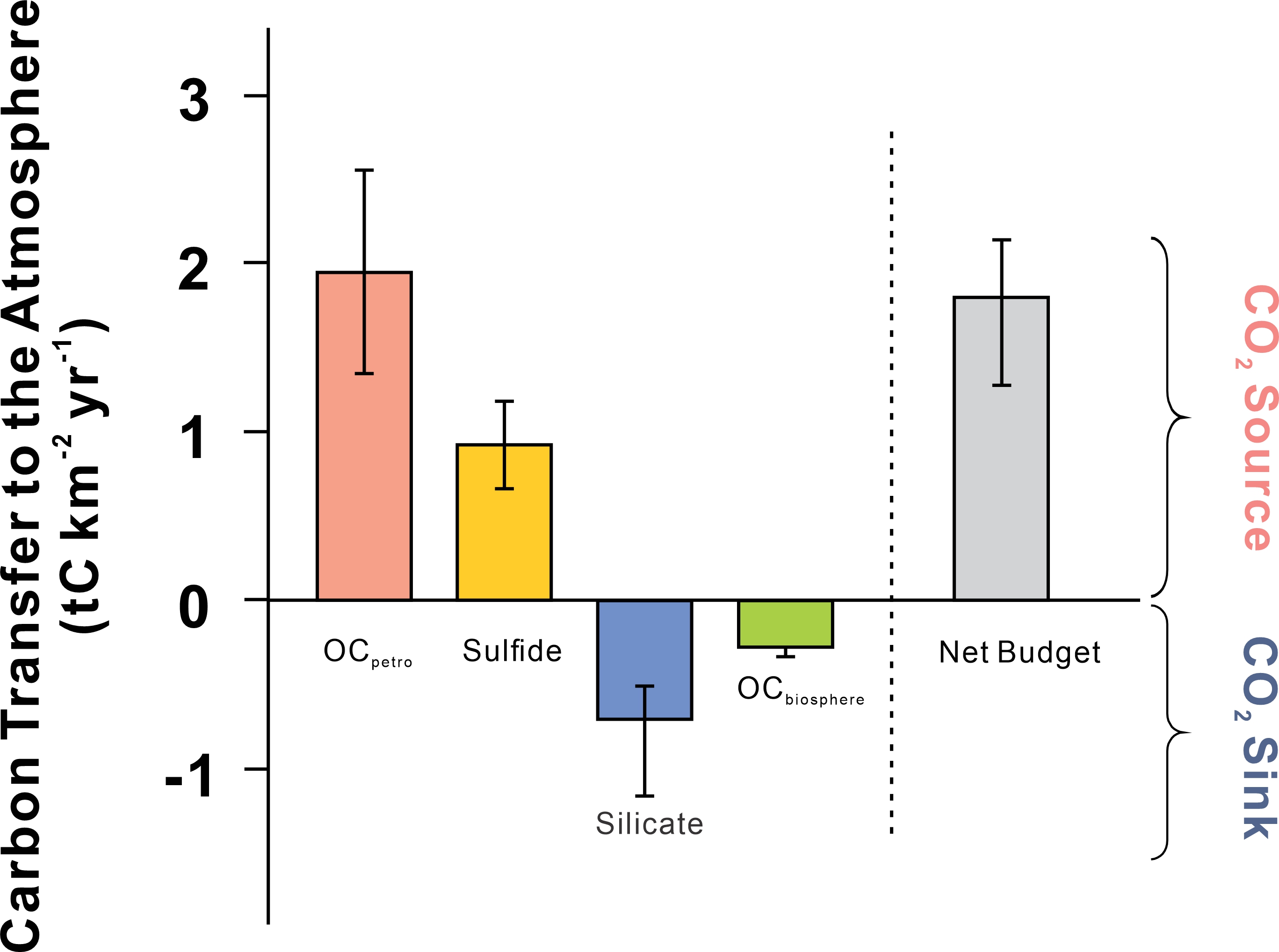 造山过程中的侵蚀与风化是地球表面和地壳之间长时间尺度(105-106年)碳循环的关键因素,深刻影响着气候的长期演变。流域尺度的净碳收支状况是多种碳源和碳汇过程综合作用的结果。其中,碳源涵盖火山及变质作用排气、岩石有机碳(Petrogenic Organic Carbon,OCpetro)风化、硫化物风化等;碳汇则包括硅酸盐化学风化以及生物有机碳埋藏。然而,部分碳循环过程,如OCpetro风化,由于受人类活动信号干扰等因素影响,目前仍缺乏全面的定量研究,这限制了对造山带净碳收支及其时间变化特征的深入理解。