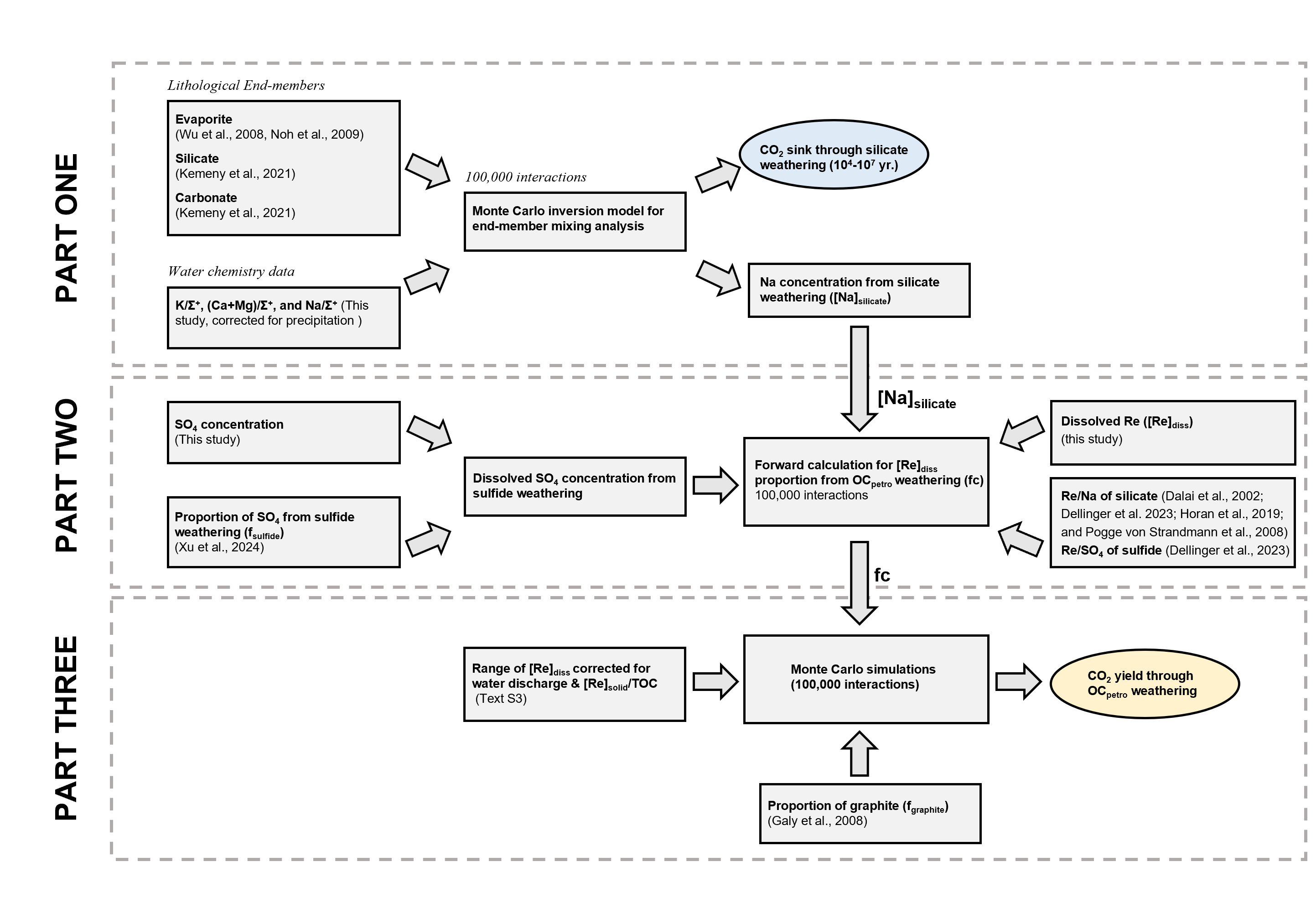 为此,pg电子官网陈骏院士和陈旸副教授课题组在流经青藏高原东缘及东南缘的长江、黄河、澜沧江、怒江及雅鲁藏布江等大河上游开展了一系列深入研究。通过分析河水及河床沉积物的主量元素组成、铼浓度、有机碳含量等指标,并结合蒙特卡罗模拟计算(图1),研究团队成功量化了研究区内的OCpetro风化通量。基于通天河的量化结果,估算出青藏高原当前的OCpetro风化通量为1.95 (±0.60)tC·km-2·yr-1,在104-107年时间尺度上的地质碳收支为1.81 +0.34/-0.49 tC·km-2·yr-1。这一结果暗示,青藏高原目前很可能是一个地质碳源(图2)。本研究拓展了当前对造山带岩石有机碳风化过程的认知,并揭示了造山带在不同阶段可能发生从碳汇向碳源转变的特征。该研究成果为深入理解青藏高原的地质碳循环提供了重要的科学依据,也为全球碳循环模型的完善提供了新的数据支撑。
