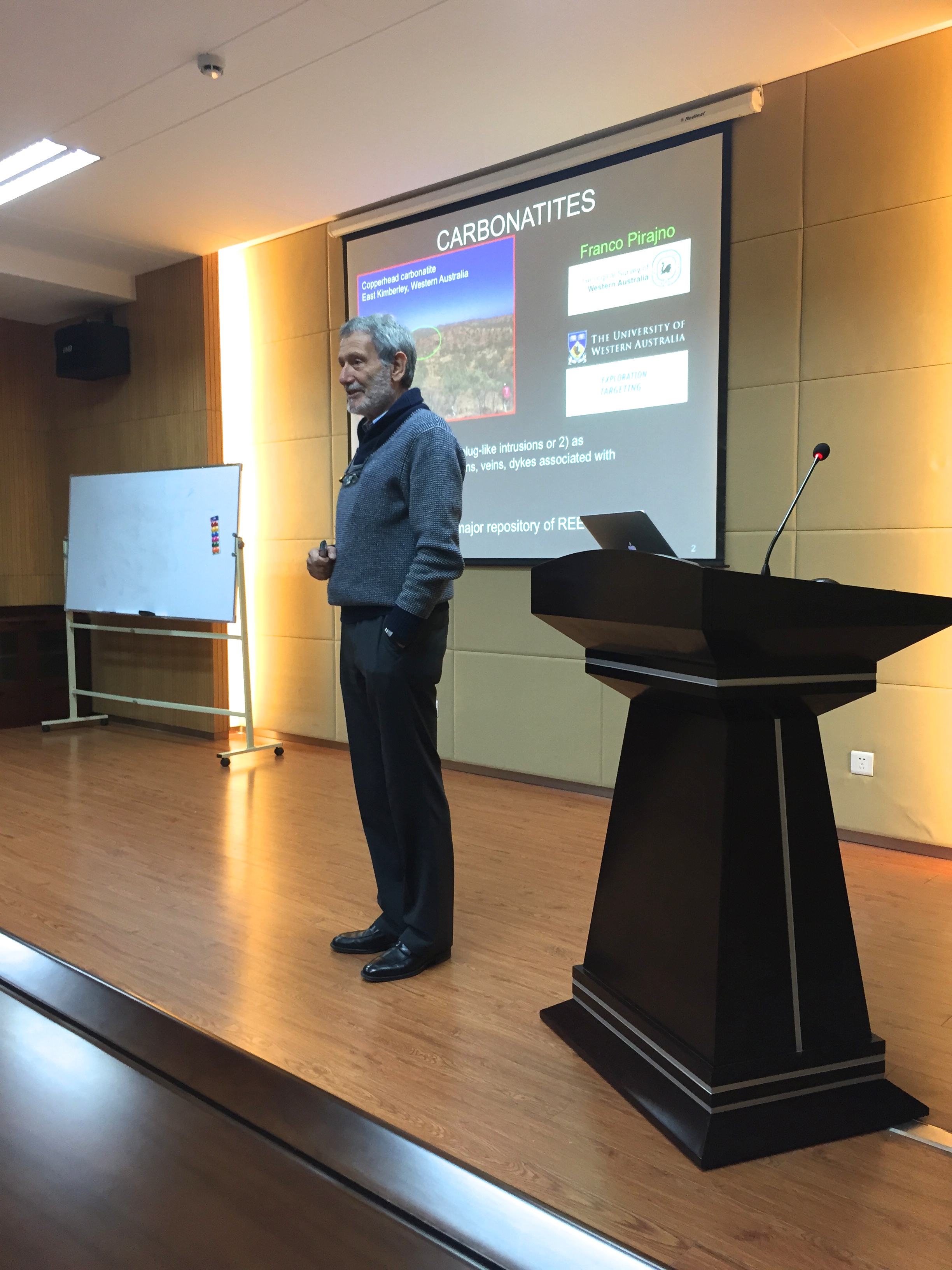 2015年1月16日上午,西澳大利亚地质调查局首席地质师,西澳大学教授Franco Pirajno应内生金属矿床成矿机制研究国家重点实验室邀请来我校访问,并做了题为《Carbonatites: A major repository of REE minerals》的学术报告。报告在pg电子官方网站仙林校区朱共山楼举行,pg电子官网院长王汝成教授主持并介绍了Pirajno教授的简历和主要学术成就。