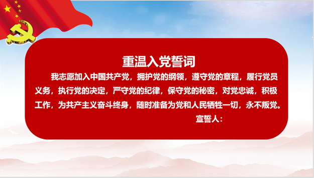 最后,大家面对屏幕上的党旗、国旗,高举右手,庄严宣誓,重温入党时的铮铮誓言,不忘入党时的初心,展现了坚定的信念和忠诚的信仰。